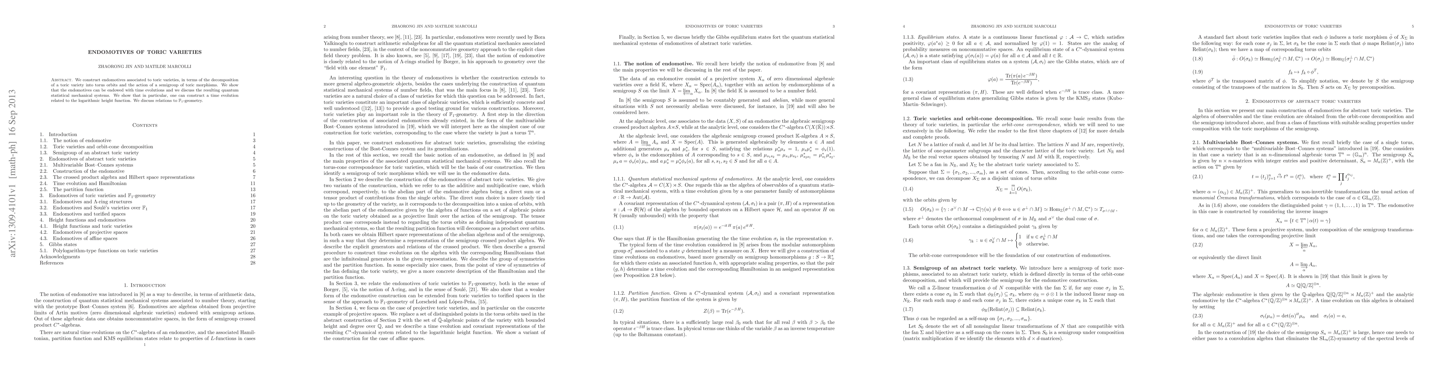 This paper constructs endomotives linked to toric varieties, utilizing their decomposition into torus orbits and the action of semigroups of toric morphisms. It explores the time evolutions of these endomotives and their implications for quantum statistical mechanics, including a time evolution tied to the logarithmic height function, and discusses connections to F1-geometry.