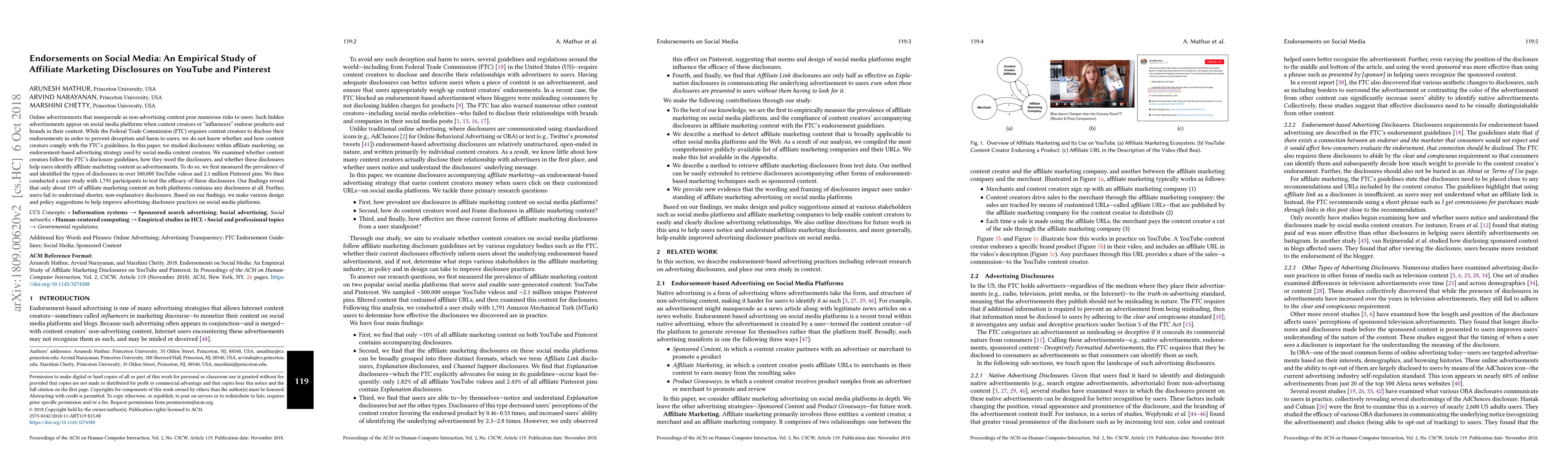 This study examines the compliance of social media influencers with FTC guidelines for disclosing affiliate marketing endorsements on YouTube and Pinterest. It finds that only 10% of content contains disclosures, and users struggle to understand brief, non-explanatory disclosures, suggesting a need for better disclosure practices.