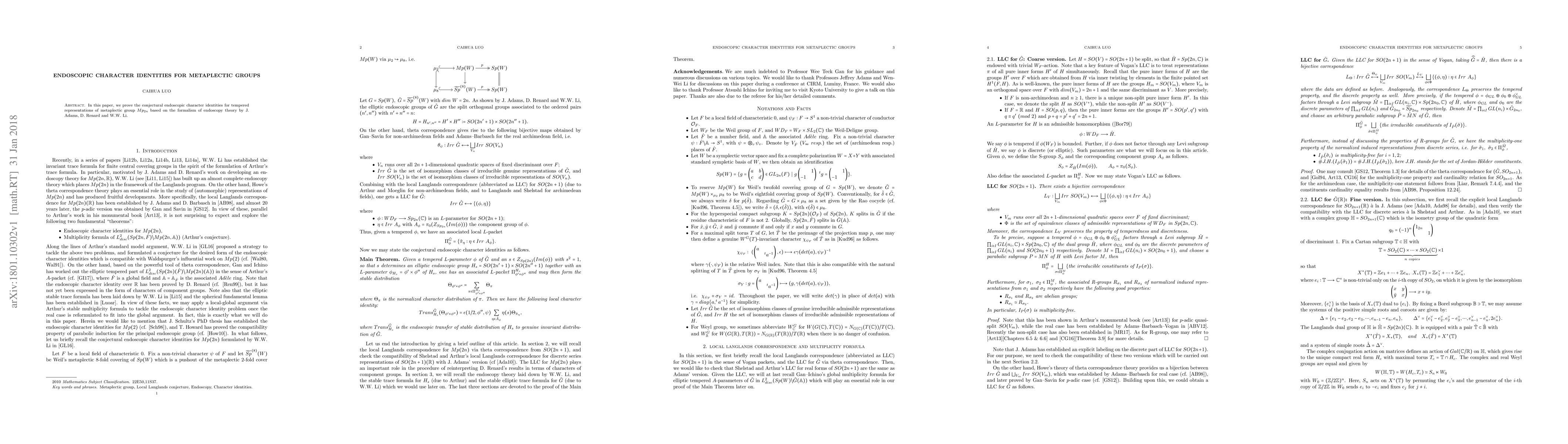 This research paper presents a proof for conjectural endoscopic character identities related to tempered representations of metaplectic group Mp_{2n}. The proof is built on the endoscopy theory framework developed by J. Adams, D. Renard, and W.W. Li.