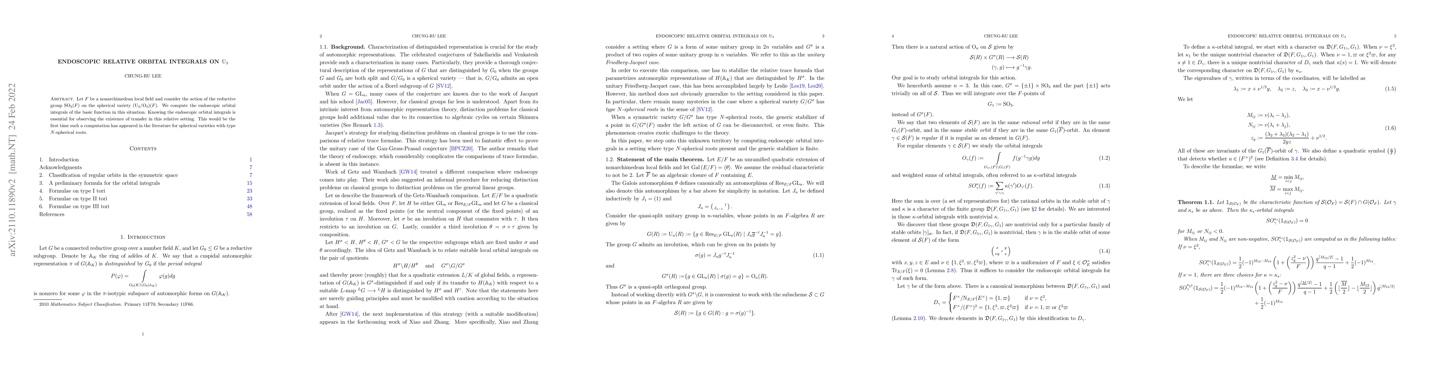 The research employs endoscopic techniques to compute relative orbital integrals on U$_3$, a spherical variety under the action of SO$_3(F)$, where F is a nonarchimedean local field. It provides the first such computation in the literature for spherical varieties with type N-spherical roots.