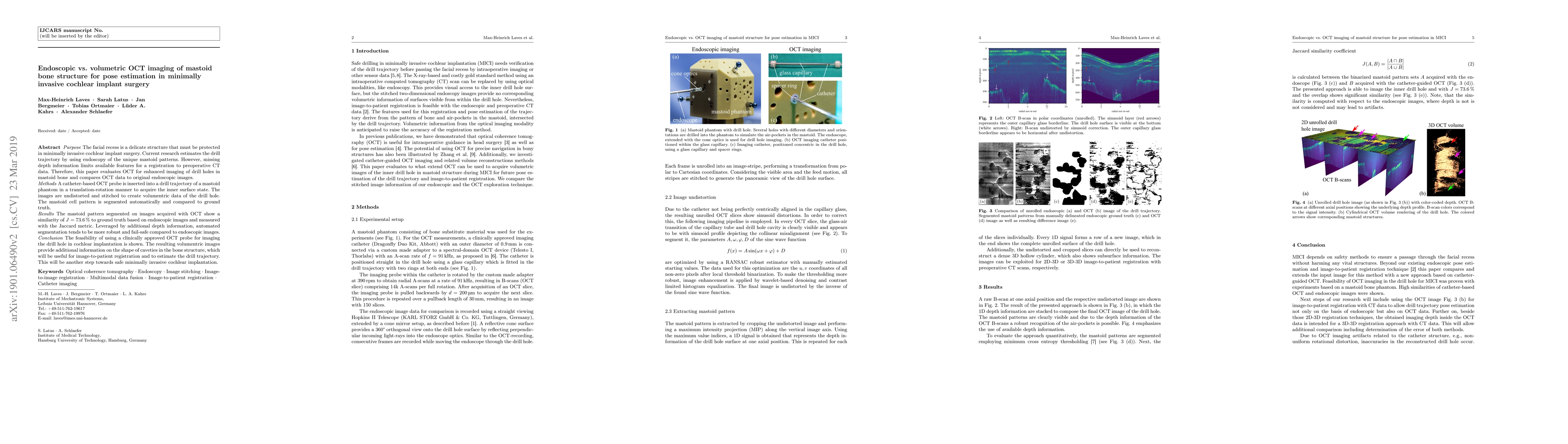 Purpose: The facial recess is a delicate structure that must be protected in minimally invasive cochlear implant surgery. Current research estimates the drill trajectory by using endoscopy of the unique mastoid patterns. However, missing depth information limits available features for a registration to preoperative CT data. Therefore, this paper evaluates OCT for enhanced imaging of drill holes in mastoid bone and compares OCT data to original endoscopic images. Methods: A catheter-based OCT probe is inserted into a drill trajectory of a mastoid phantom in a translation-rotation manner to acquire the inner surface state. The images are undistorted and stitched to create volumentric data of the drill hole. The mastoid cell pattern is segmented automatically and compared to ground truth. Results: The mastoid pattern segmented on images acquired with OCT show a similarity of J = 73.6 % to ground truth based on endoscopic images and measured with the Jaccard metric. Leveraged by additional depth information, automated segmentation tends to be more robust and fail-safe compared to endoscopic images. Conclusion: The feasibility of using a clinically approved OCT probe for imaging the drill hole in cochlear implantation is shown. The resulting volumentric images provide additional information on the shape of caveties in the bone structure, which will be useful for image-to-patient registration and to estimate the drill trajectory. This will be another step towards safe minimally invasive cochlear implantation.