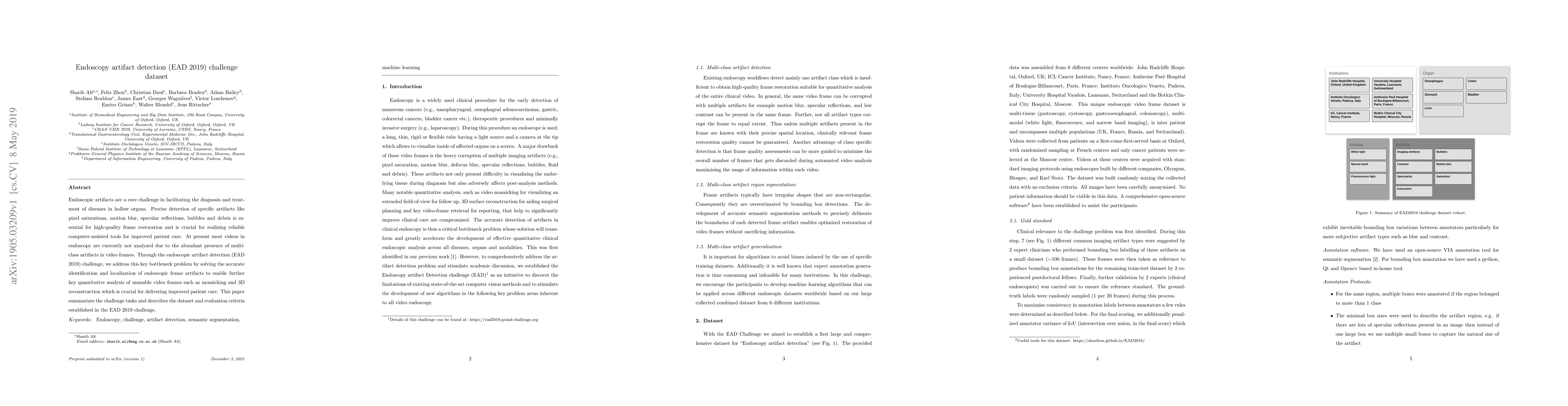 Endoscopic artifacts are a core challenge in facilitating the diagnosis and treatment of diseases in hollow organs. Precise detection of specific artifacts like pixel saturations, motion blur, specular reflections, bubbles and debris is essential for high-quality frame restoration and is crucial for realizing reliable computer-assisted tools for improved patient care. At present most videos in endoscopy are currently not analyzed due to the abundant presence of multi-class artifacts in video frames. Through the endoscopic artifact detection (EAD 2019) challenge, we address this key bottleneck problem by solving the accurate identification and localization of endoscopic frame artifacts to enable further key quantitative analysis of unusable video frames such as mosaicking and 3D reconstruction which is crucial for delivering improved patient care. This paper summarizes the challenge tasks and describes the dataset and evaluation criteria established in the EAD 2019 challenge.