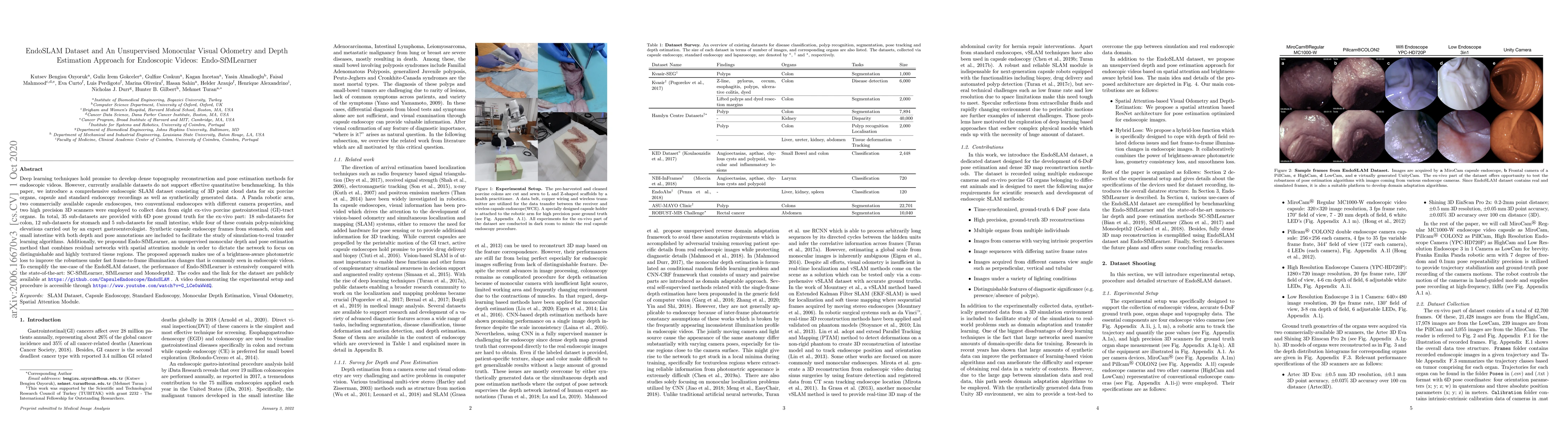 This paper introduces the EndoSLAM dataset, a comprehensive collection of endoscopic SLAM data for quantitative benchmarking, including 3D point clouds, 6D pose ground truth, and synthetic data. It also proposes Endo-SfMLearner, an unsupervised monocular visual odometry and depth estimation method for endoscopic videos, which leverages residual networks and spatial attention to focus on textured regions.