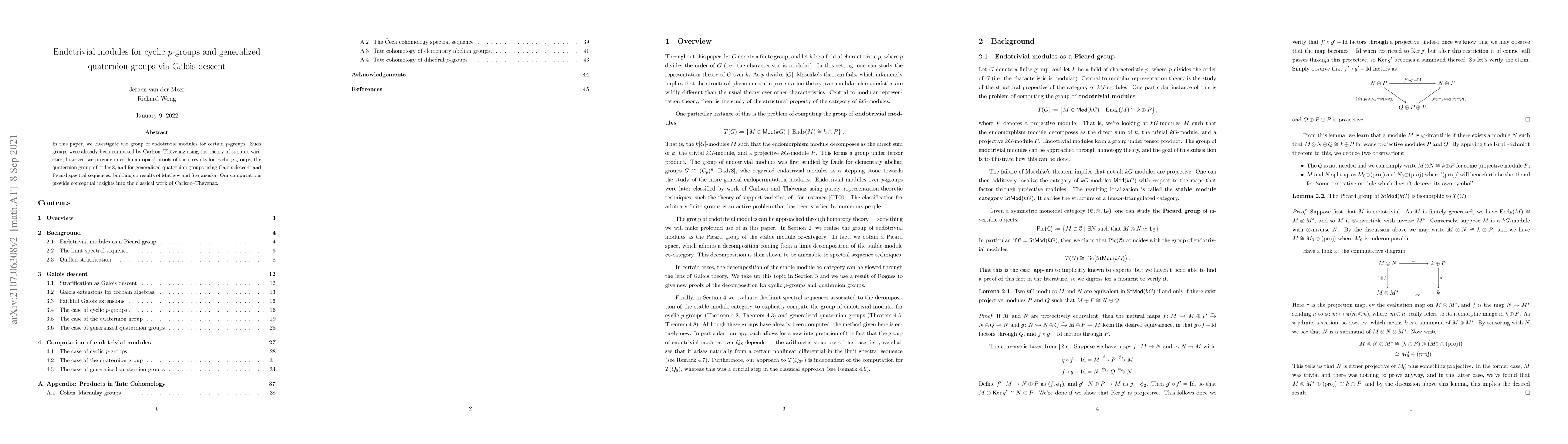 This paper offers novel homotopical proofs for endotrivial modules of cyclic $p$-groups, the quaternion group of order 8, and generalized quaternion groups, using Galois descent and Picard spectral sequences to provide conceptual insights into Carlson-Th\'evenaz's classical work.