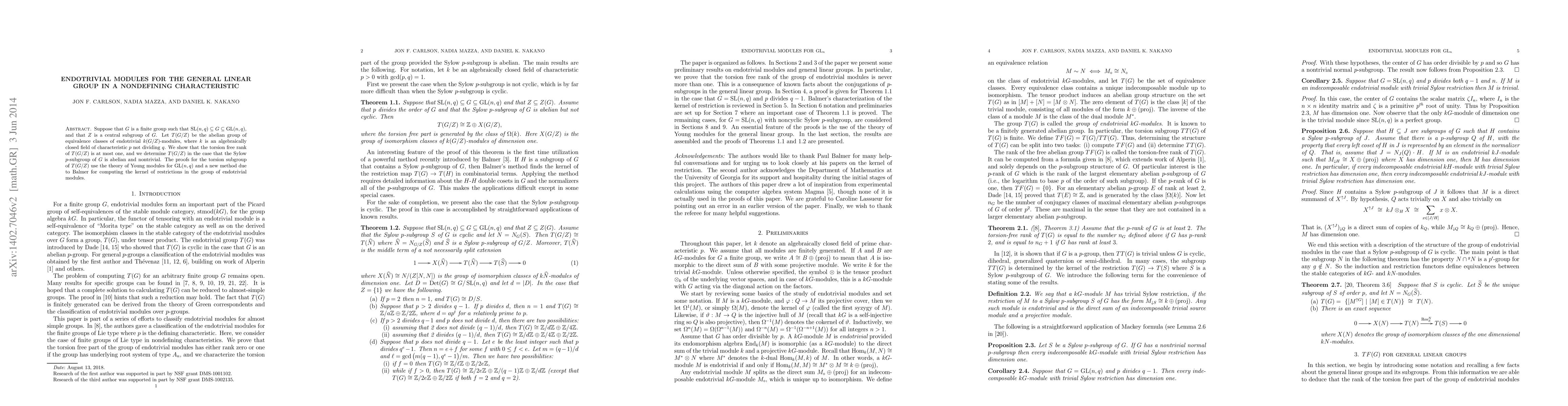 This paper investigates endotrivial modules for the general linear group $G$ when the characteristic of the field does not divide the order of $G$. It demonstrates that the torsion-free rank of endotrivial modules is at most one and determines these modules when $G$ contains an abelian Sylow $p$-subgroup.