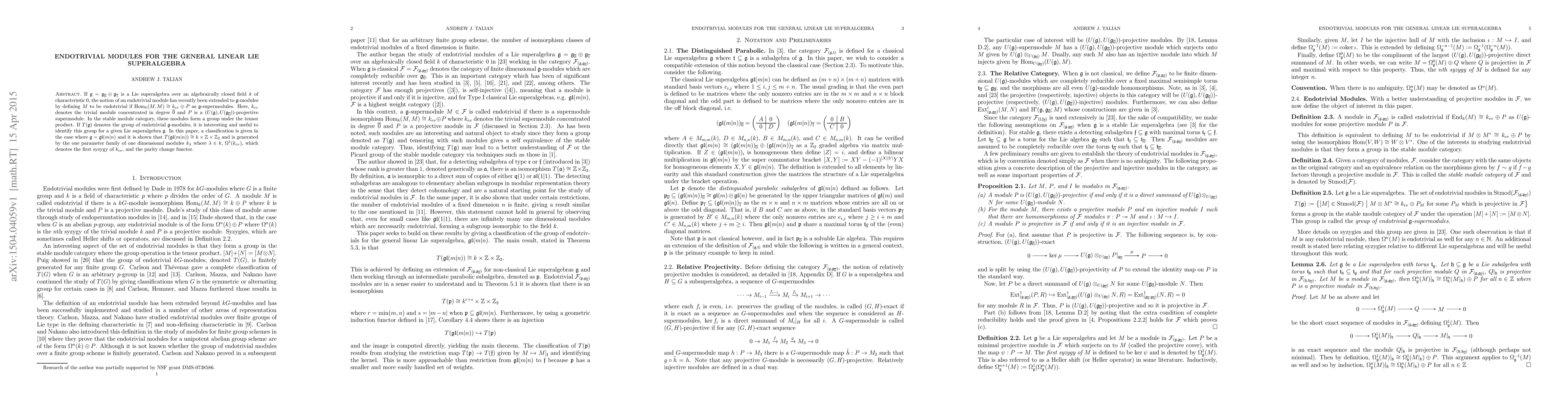 The paper introduces a classification of endotrivial modules for the general linear Lie superalgebra, extending previous work on classical Lie algebras.