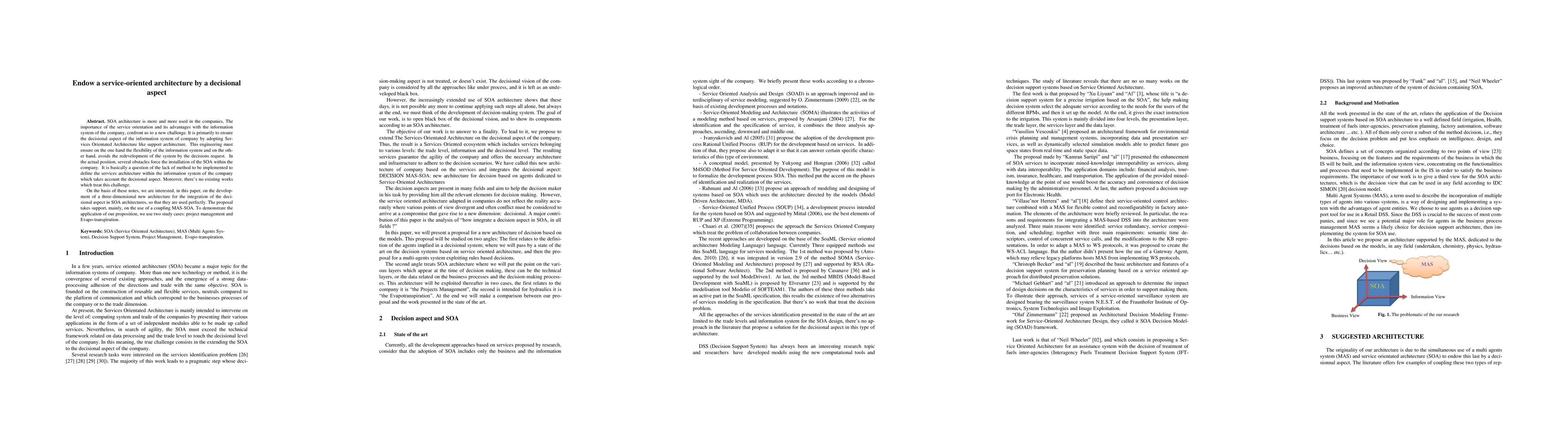This paper proposes a three-dimensional architecture to integrate decisional aspects into Service-Oriented Architectures (SOA) to enhance flexibility and avoid system redevelopment. The approach uses a coupling of Multi-Agent Systems (MAS) with SOA, demonstrated through project management and evapotranspiration study cases.