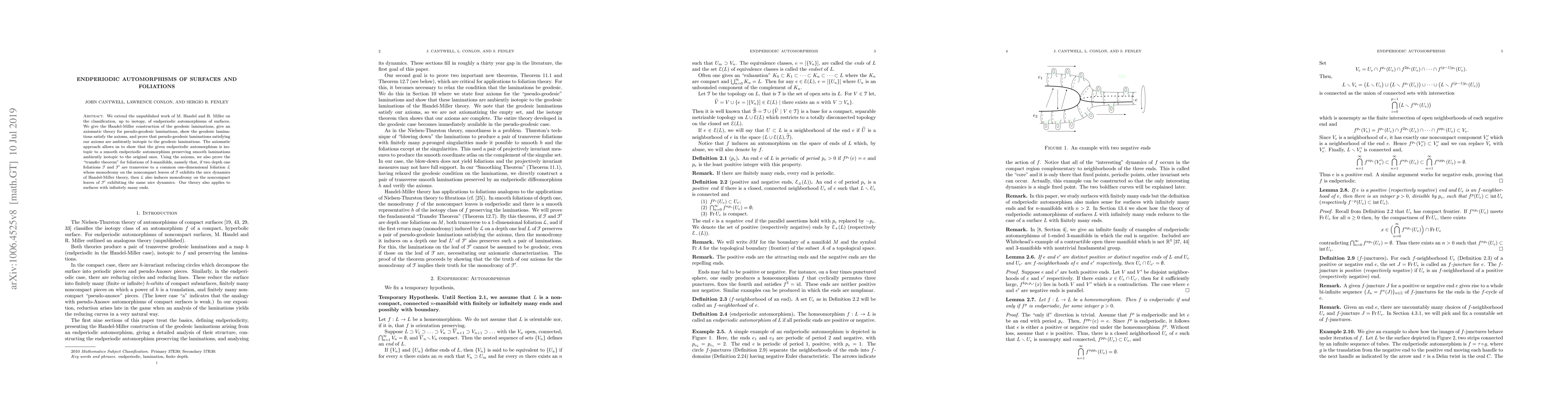 We extend the unpublished work of M. Handel and R. Miller on the classification, up to isotopy, of endperiodic automorphisms of surfaces. We give the Handel-Miller construction of the geodesic laminations, give an axiomatic theory for pseudo-geodesic lamaniations, show the geodesic laminations satisfy the axioms, and prove that paeudo-geodesic laminations satisfying our axioms are ambiently isotopic to the geodesic laminations. The axiomatic approach allows us to show that the given endperiodic automorphism is isotopic to a smooth endperiodic automorphism preserving smooth laminations ambiently isotopic to the original ones. Using the axioms, we also prove the "transfer theorem" for foliations of 3-manifolds., namely that, if two depth one foliations are transverse to a common one-dimensional foliation whose monodromy on the noncompact leaves of the first foliation exhibits the nice dynamics of Handel-Miller theory, then the transverse one-dimensional foliation also induces monodromy on the noncompact leaves of the second foliation exhibiting the same nice dynamics. Our theory also applies to surfaces with infinitely many ends.