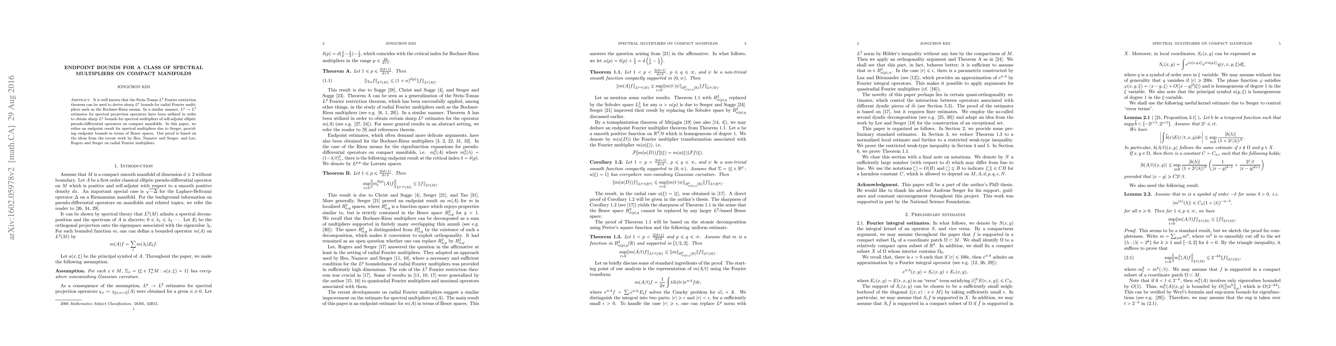 This paper refines endpoint bounds for spectral multipliers on compact manifolds, utilizing $L^p \to L^2$ estimates for spectral projection operators and Besov spaces, building on recent work on radial Fourier multipliers.