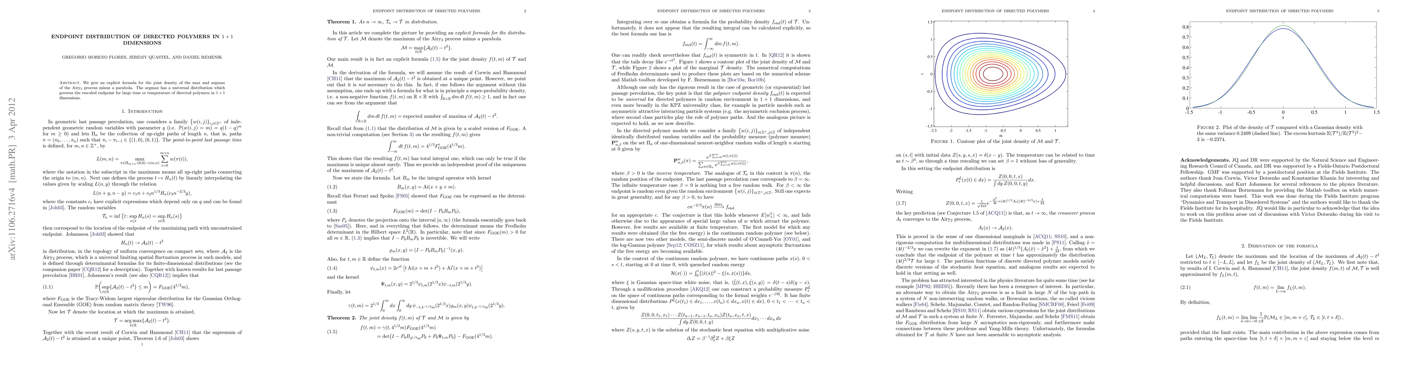 This paper provides an explicit formula for the joint density of the maximum and its location in the Airy$_2$ process, revealing a universal distribution that determines the rescaled endpoint behavior of directed polymers in 1+1 dimensions as time or temperature increases.