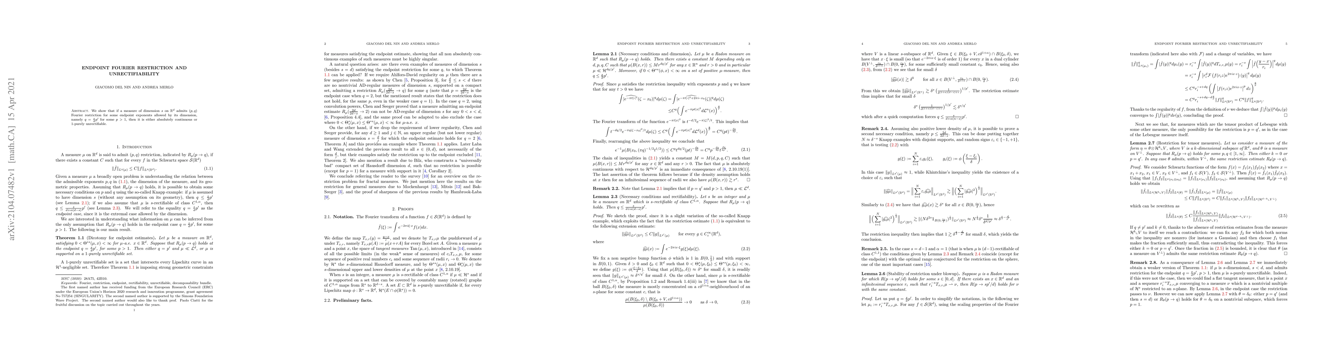 This research paper shows that a measure of dimension s on R^d is either absolutely continuous or 1-purely unrectifiable if it admits Fourier restriction for certain endpoint exponents.