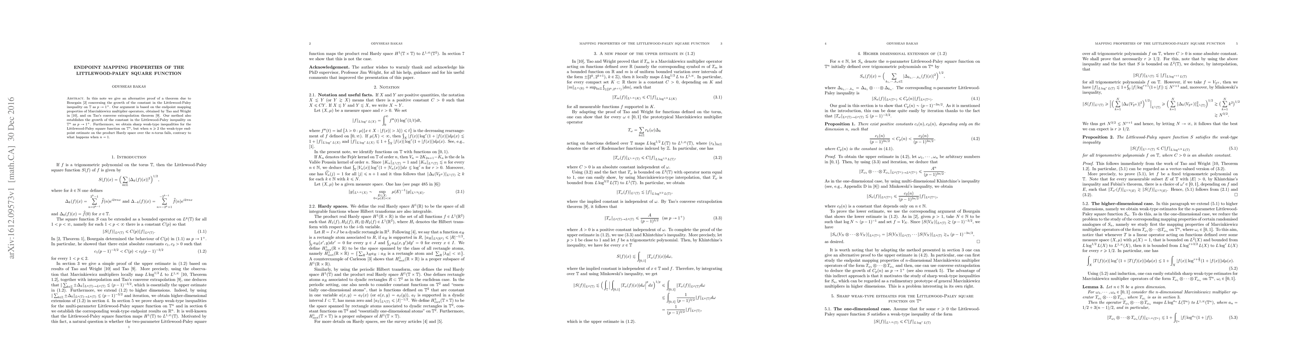 In this note we give an alternative proof of a theorem due to Bourgain \cite{Bourgain} concerning the growth of the constant in the Littlewood-Paley inequality on $\mathbb{T}$ as $p \rightarrow 1^+$. Our argument is based on the endpoint mapping properties of Marcinkiewicz multiplier operators, obtained by Tao and Wright in \cite{TW}, and on Tao's converse extrapolation theorem \cite{Tao}. Our method also establishes the growth of the constant in the Littlewood-Paley inequality on $\mathbb{T}^n$ as $p \rightarrow 1^+$. Furthermore, we obtain sharp weak-type inequalities for the Littlewood-Paley square function on $\mathbb{T}^n$, but when $n \geq 2$ the weak-type endpoint estimate on the product Hardy space over the $n$-torus fails, contrary to what happens when $n=1$.