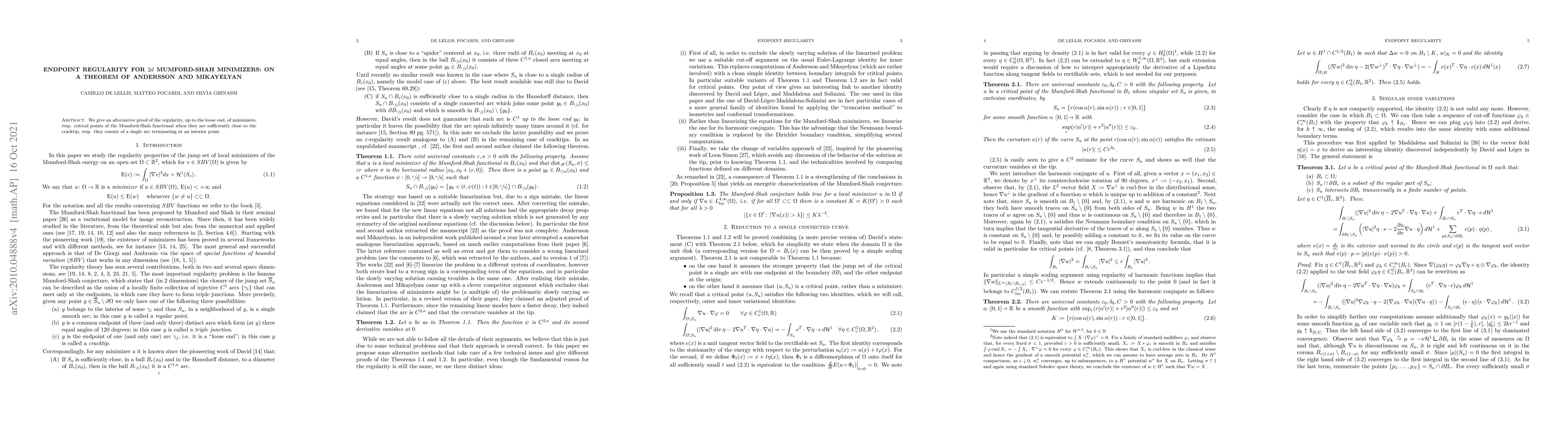 Summary: This paper presents an alternative proof for the endpoint regularity of 2D Mumford-Shah minimizers near cracktips or single arcs ending at interior points. The focus is on the regularity up to the loose end.