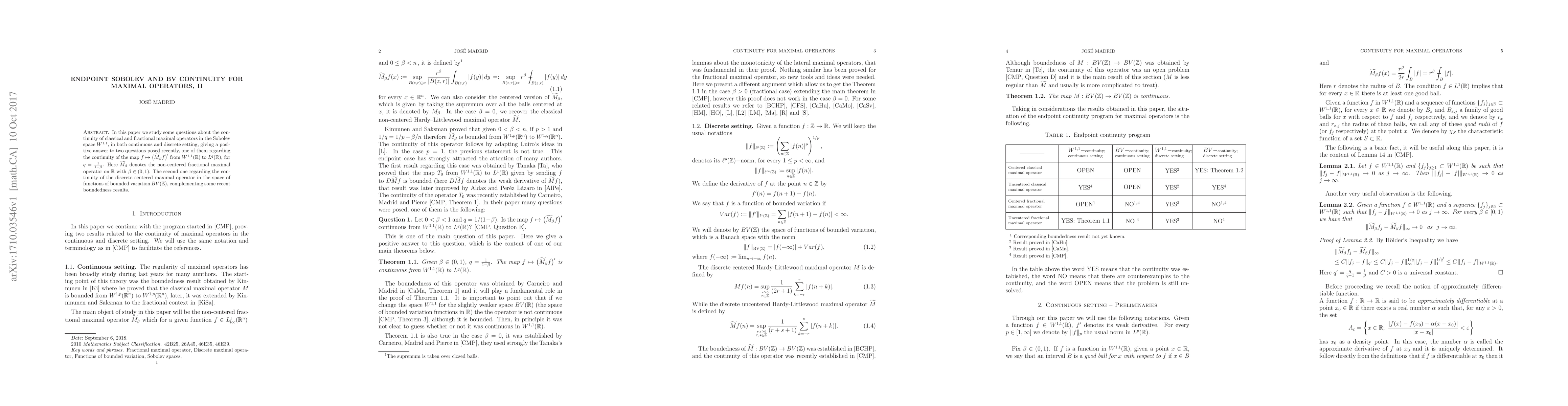 In this paper we study some questions about the continuity of classical and fractional maximal operators in the Sobolev space $W^{1,1}$, in both continuous and discrete setting, giving a positive answer to two questions posed recently, one of them regarding the continuity of the map $f \mapsto \big(\widetilde M_{\beta}f\big)'$ from $W^{1,1}(\mathbb{R})$ to $L^q(\mathbb{R})$, for $q=\frac{1}{1-\beta}$. Here $\widetilde M_{\beta}$ denotes the non-centered fractional maximal operator on $\mathbb{R}$ with $\beta\in(0,1)$. The second one regarding the continuity of the discrete centered maximal operator in the space of functions of bounded variation BV$(\mathbb{Z})$, complementing some recent boundedness results.