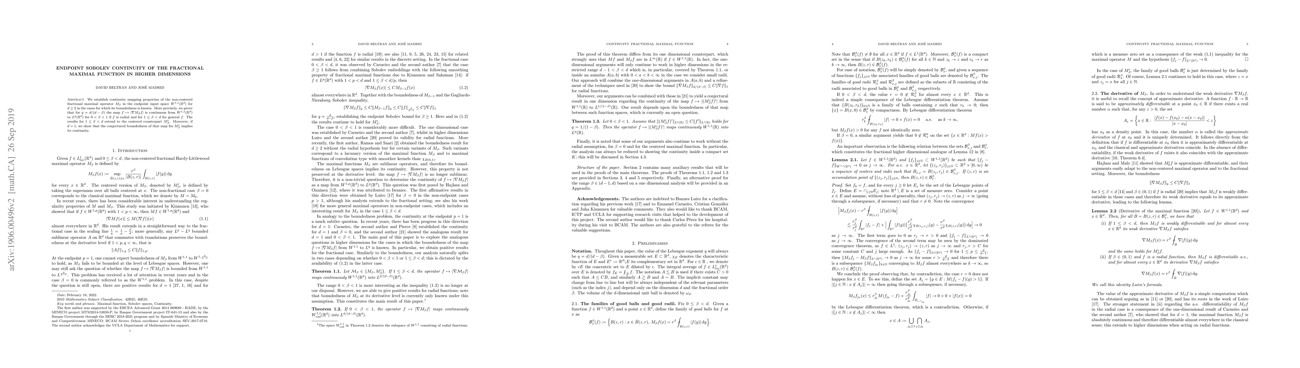 We establish continuity mapping properties of the non-centered fractional maximal operator $M_{\beta}$ in the endpoint input space $W^{1,1}(\mathbb{R}^d)$ for $d \geq 2$ in the cases for which its boundedness is known. More precisely, we prove that for $q=d/(d-\beta)$ the map $f \mapsto |\nabla M_\beta f|$ is continuous from $W^{1,1}(\mathbb{R}^d)$ to $L^{q}(\mathbb{R}^d)$ for $ 0 < \beta < 1$ if $f$ is radial and for $1 \leq \beta < d$ for general $f$. The results for $1\leq \beta < d$ extend to the centered counterpart $M_\beta^c$. Moreover, if $d=1$, we show that the conjectured boundedness of that map for $M_\beta^c$ implies its continuity.