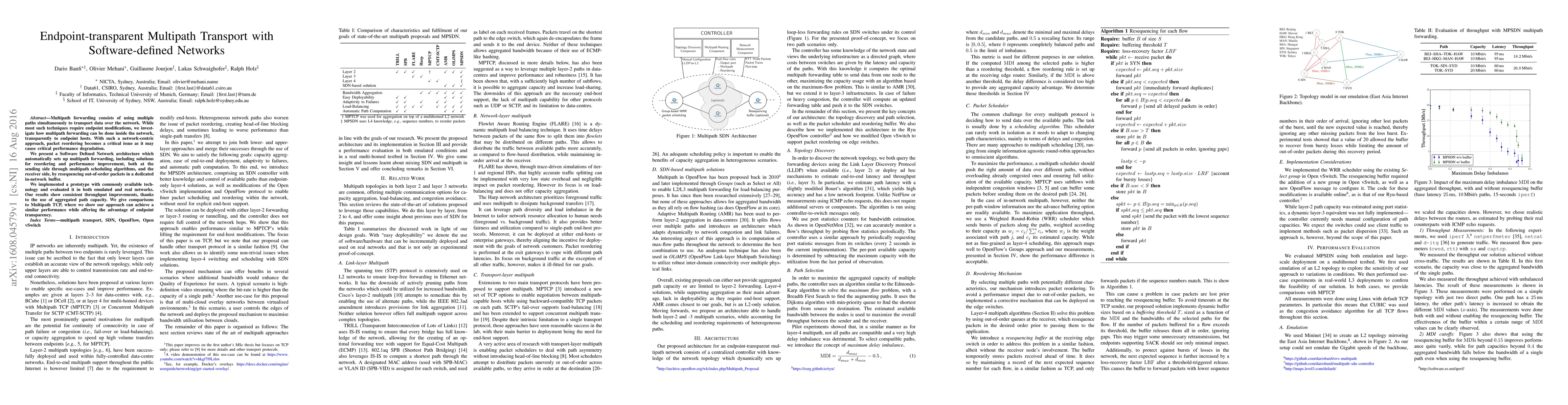Multipath forwarding consists of using multiple paths simultaneously to transport data over the network. While most such techniques require endpoint modifications, we investigate how multipath forwarding can be done inside the network, transparently to endpoint hosts. With such a network-centric approach, packet reordering becomes a critical issue as it may cause critical performance degradation. We present a Software Defined Network architecture which automatically sets up multipath forwarding, including solutions for reordering and performance improvement, both at the sending side through multipath scheduling algorithms, and the receiver side, by resequencing out-of-order packets in a dedicated in-network buffer. We implemented a prototype with commonly available technology and evaluated it in both emulated and real networks. Our results show consistent throughput improvements, thanks to the use of aggregated path capacity. We give comparisons to Multipath TCP, where we show our approach can achieve a similar performance while offering the advantage of endpoint transparency.