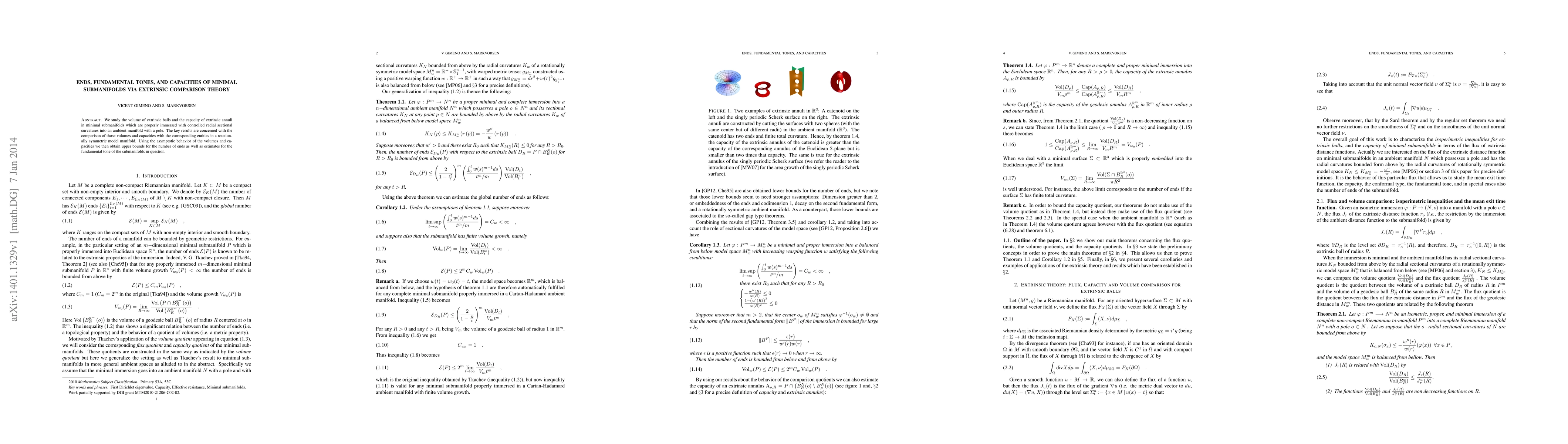 This paper investigates the volume of extrinsic balls and capacity of annuli in minimal submanifolds with controlled curvatures, comparing them to a rotationally symmetric model. It derives upper bounds for the number of ends and estimates for the fundamental tone using asymptotic behavior.