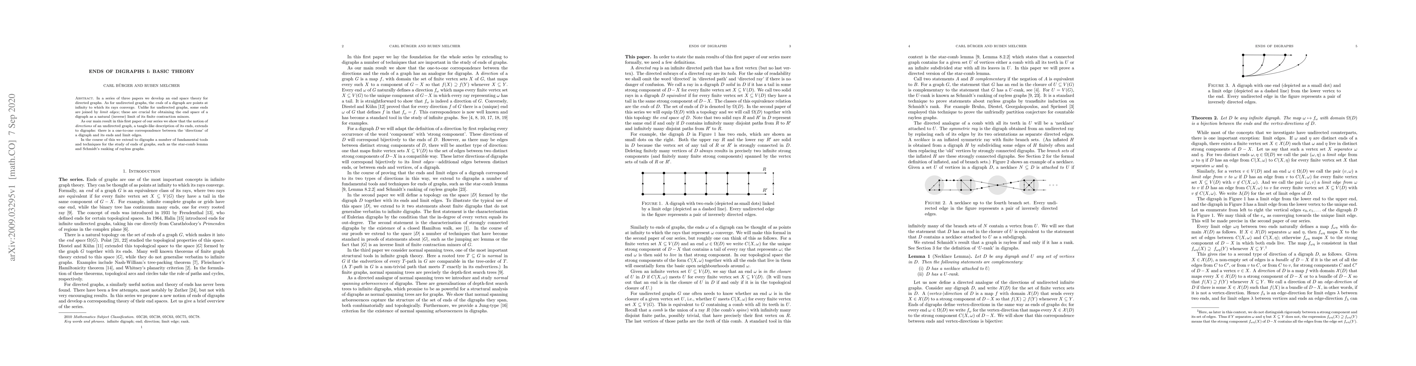 This paper introduces the foundational theory for the ends of directed graphs (digraphs), extending the concept of directions from undirected graphs to digraphs. It establishes a one-to-one correspondence between the directions of a digraph and its ends and limit edges, and adapts key graph theory tools for this new context.