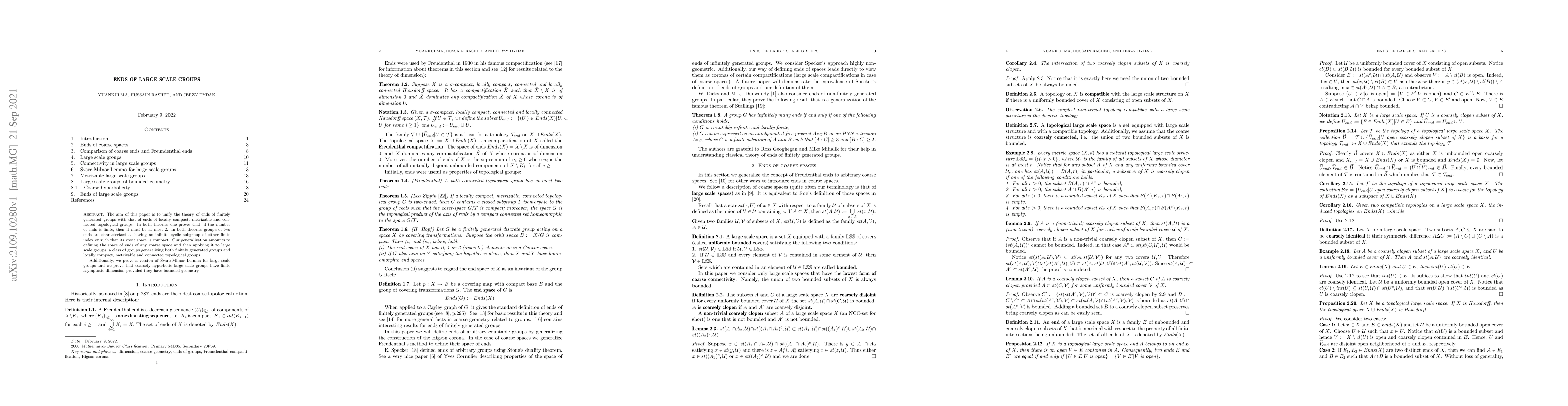 This paper unifies the theory of ends for both finitely generated groups and locally compact, metrizable connected topological groups, showing that groups with a finite number of ends are at most two-ended. It generalizes the concept to large scale groups, proves a Svarc-Milnor Lemma variant, and establishes that coarsely hyperbolic large scale groups with bounded geometry have finite asymptotic dimension.