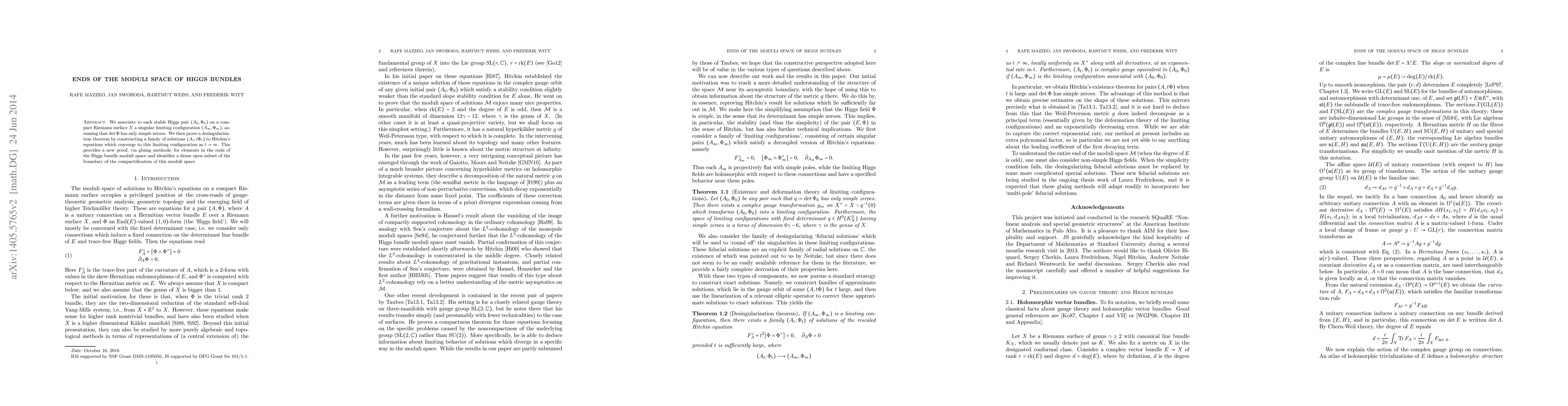We associate to each stable Higgs pair $(A_0,\Phi_0)$ on a compact Riemann surface $X$ a singular limiting configuration $(A_\infty,\Phi_\infty)$, assuming that $\det \Phi$ has only simple zeroes. We then prove a desingularization theorem by constructing a family of solutions $(A_t,t\Phi_t)$ to Hitchin's equations which converge to this limiting configuration as $t \to \infty$. This provides a new proof, via gluing methods, for elements in the ends of the Higgs bundle moduli space and identifies a dense open subset of the boundary of the compactification of this moduli space.