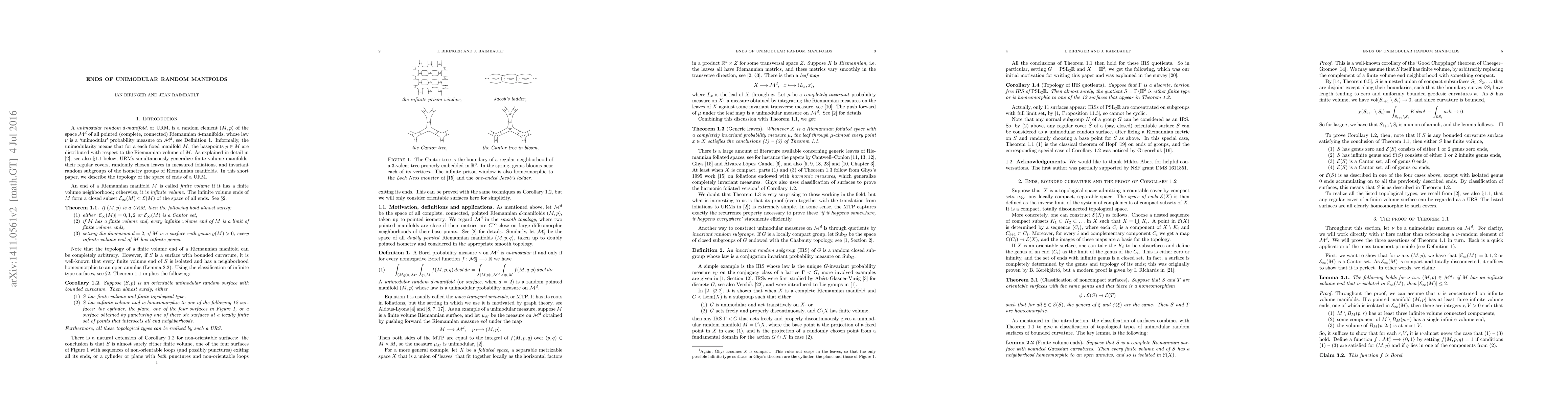 We study the ends of a generic manifold, with respect to a unimodular measure on the space of pointed Riemannian manifolds with bounded curvatures. We apply our general result to the case of surfaces and obtain as corollaries a very precise description of generic leaves for foliations with invariant measures and of quotients of the hyperbolic plane by invariant random subgroups of the isometry group.