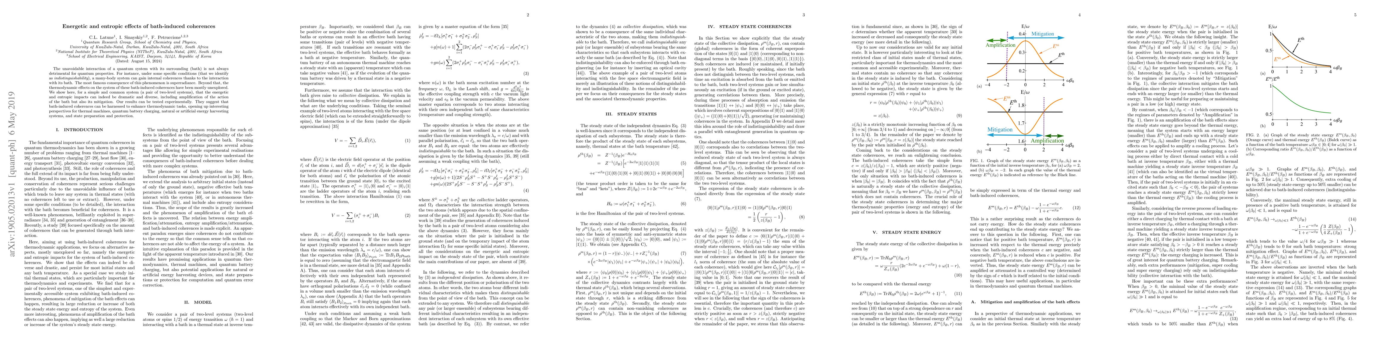 The unavoidable interaction of a quantum system with its surrounding (bath) is not always detrimental for quantum properties. For instance, under some specific conditions (that we identify as indistinguishability), a many-body system can gain internal coherences thanks to the interaction with its bath. The most famous consequence of this phenomenon is superradiance. Beyond that, the thermodynamic effects on the system of these bath-induced coherences have been mostly unexplored. We show here, for a simple and common system (a pair of two-level systems), that the energetic and entropic impacts can indeed be dramatic and diverse, including amplification of the action of the bath but also its mitigation. Our results can be tested experimentally. They suggest that bath-induced coherences can be harnessed to enhance thermodynamic tasks, opening up interesting perspectives for thermal machines, quantum battery charging, natural or artificial energy harvesting systems, and state preparation and protection.