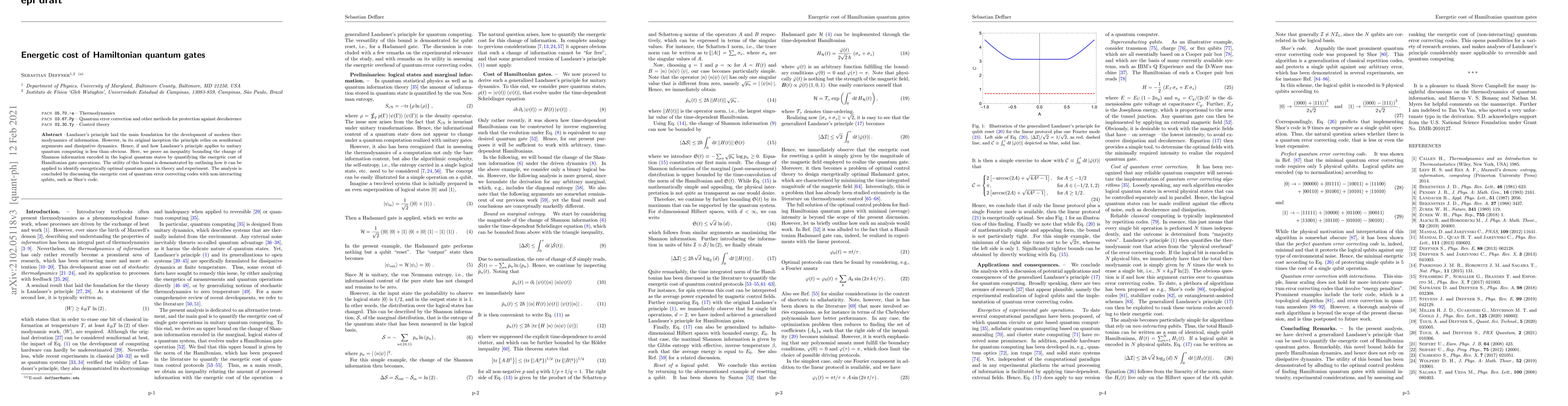 This paper establishes an inequality to quantify the energetic cost of Hamiltonian quantum gates, extending Landauer's principle to unitary quantum computing. It demonstrates the practical application of this bound in identifying energetically optimal quantum gates and discusses the implications for quantum error correction codes.