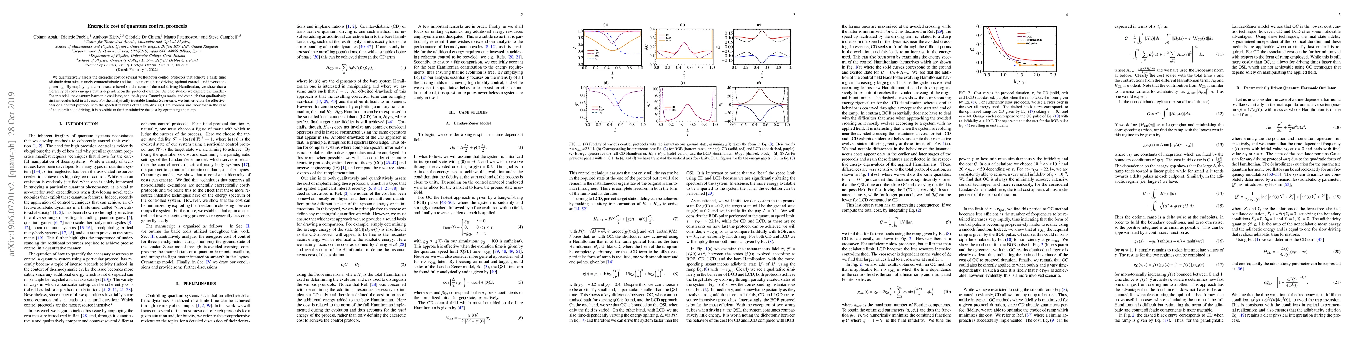 This paper evaluates the energetic cost of various quantum control protocols, including counterdiabatic, local counterdiabatic driving, optimal control, and inverse engineering, using a norm-based cost measure. The study reveals a protocol-dependent cost hierarchy influenced by protocol duration, demonstrated through models like Landau-Zener, quantum harmonic oscillator, and Jaynes-Cummings.
