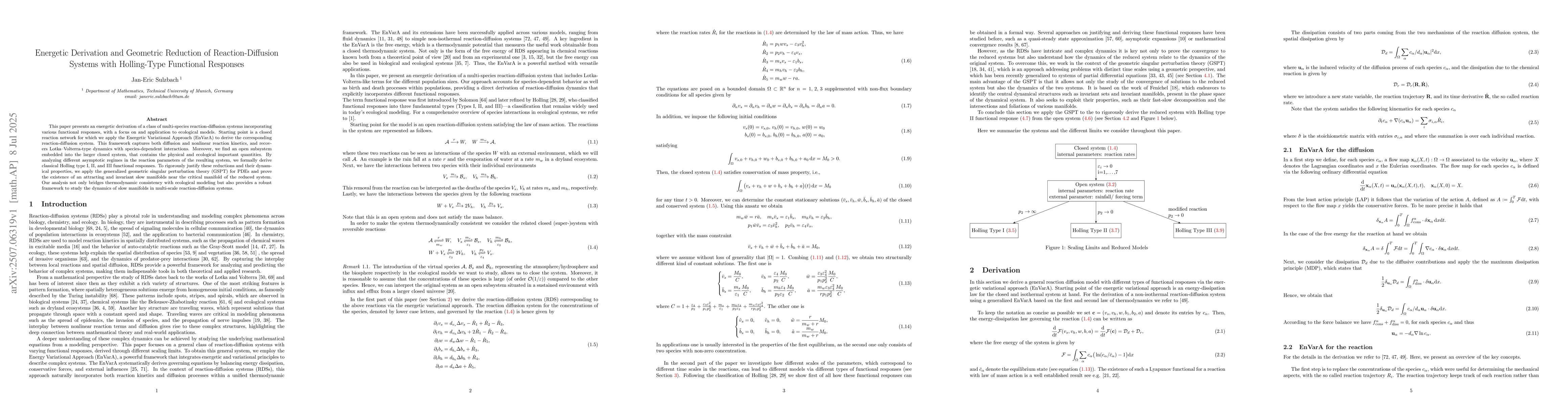 This paper presents an energetic derivation of a class of multi-species reaction-diffusion systems incorporating various functional responses, with a focus on and application to ecological models. Starting point is a closed reaction network for which we apply the Energetic Variational Approach (EnVarA) to derive the corresponding reaction-diffusion system. This framework captures both diffusion and nonlinear reaction kinetics, and recovers Lotka-Volterra-type dynamics with species-dependent interactions. Moreover, we find an open subsystem embedded into the larger closed system, that contains the physical and ecological important quantities. By analyzing different asymptotic regimes in the reaction parameters of the resulting system, we formally derive classical Holling type I, II, and III functional responses. To rigorously justify these reductions and their dynamical properties, we apply the generalized geometric singular perturbation theory (GSPT) for PDEs and prove the existence of an attracting and invariant slow manifolds near the critical manifold of the reduced system. Our analysis not only bridges thermodynamic consistency with ecological modeling but also provides a robust framework to study the dynamics of slow manifolds in multi-scale reaction-diffusion systems.