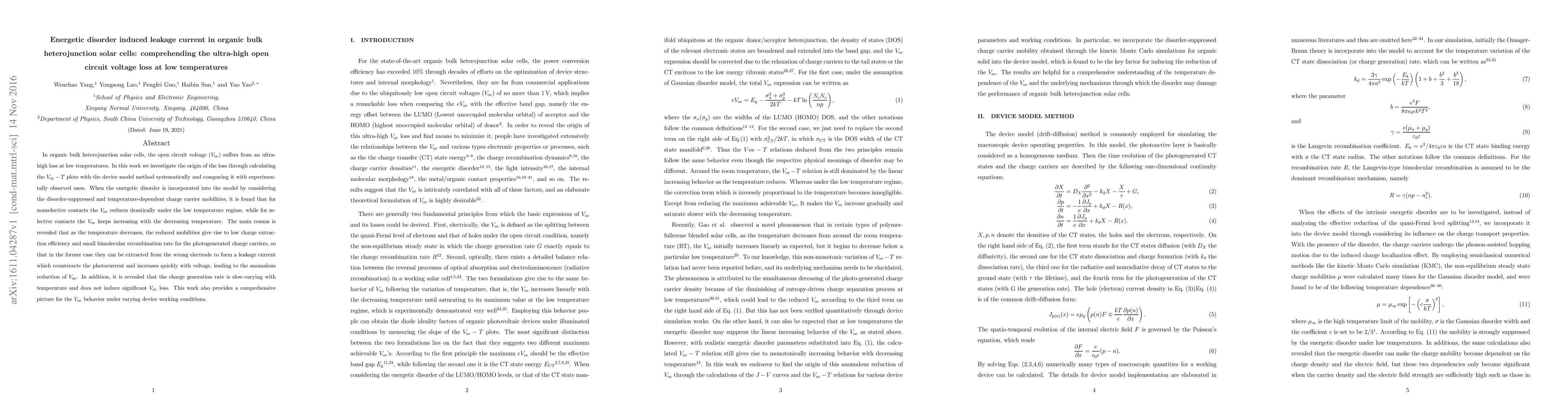 This paper investigates the ultra-high open circuit voltage loss in organic bulk heterojunction solar cells at low temperatures, attributing it to energetic disorder that reduces charge carrier mobility and leads to leakage current. The study reveals that nonselective contacts exacerbate this loss, while selective contacts maintain higher voltages.