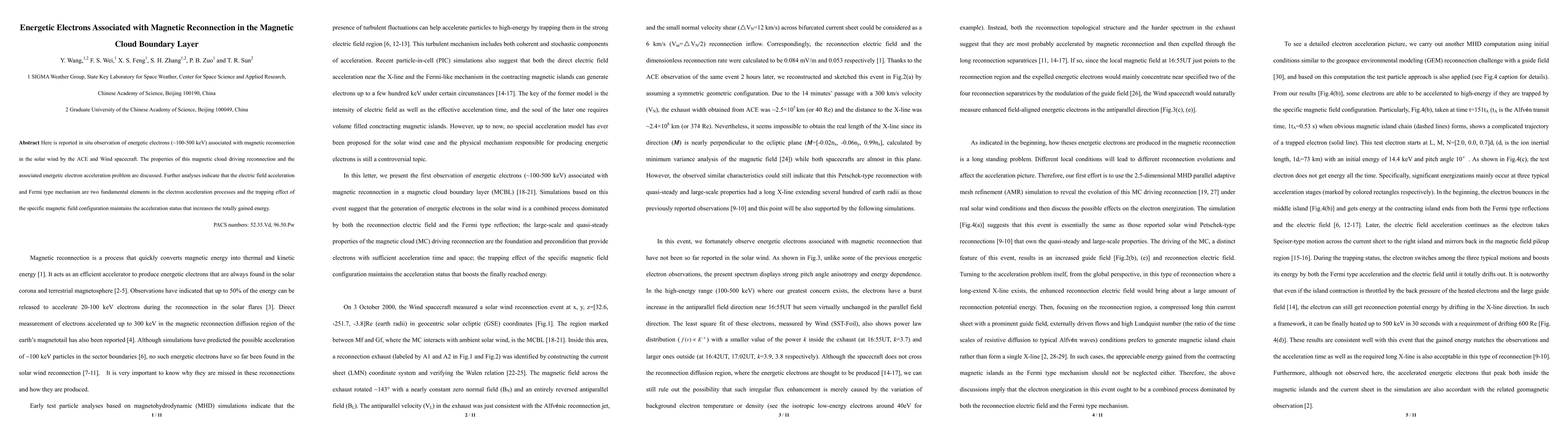 Here is reported in situ observation of energetic electrons (~100-500 keV) associated with magnetic reconnection in the solar wind by the ACE and Wind spacecraft. The properties of this magnetic cloud driving reconnection and the associated energetic electron acceleration problem are discussed. Further analyses indicate that the electric field acceleration and Fermi type mechanism are two fundamental elements in the electron acceleration processes and the trapping effect of the specific magnetic field configuration maintains the acceleration status that increases the totally gained energy.