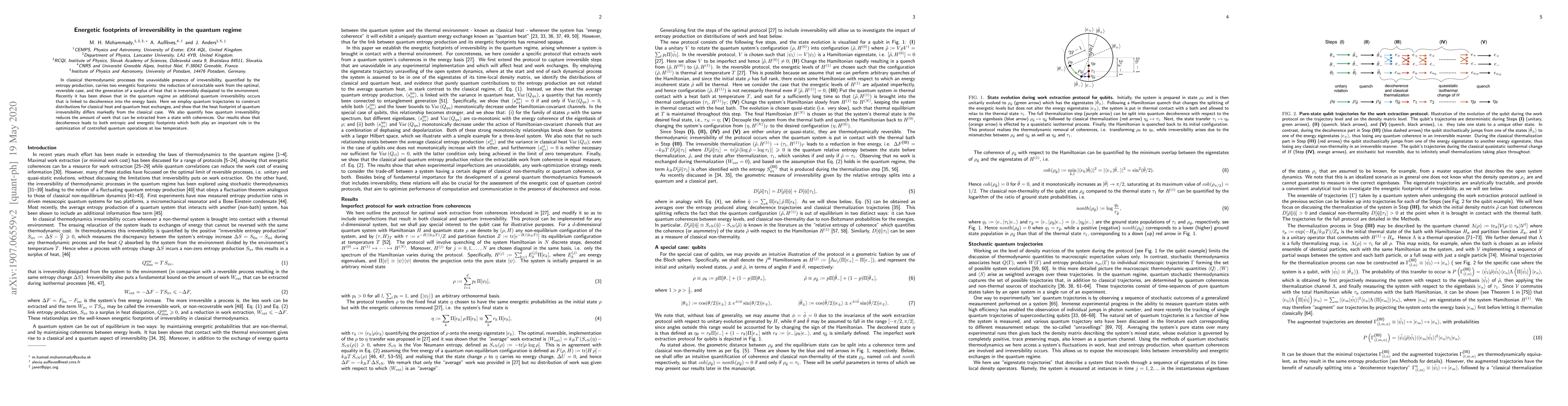 In classical thermodynamic processes the unavoidable presence of irreversibility, quantified by the entropy production, carries two energetic footprints: the reduction of extractable work from the optimal, reversible case, and the generation of a surplus of heat that is irreversibly dissipated to the environment. Recently it has been shown that in the quantum regime an additional quantum irreversibility occurs that is linked to decoherence into the energy basis. Here we employ quantum trajectories to construct distributions for classical heat and quantum heat exchanges, and show that the heat footprint of quantum irreversibility differs markedly from the classical case. We also quantify how quantum irreversibility reduces the amount of work that can be extracted from a state with coherences. Our results show that decoherence leads to both entropic and energetic footprints which both play an important role in the optimization of controlled quantum operations at low temperature.