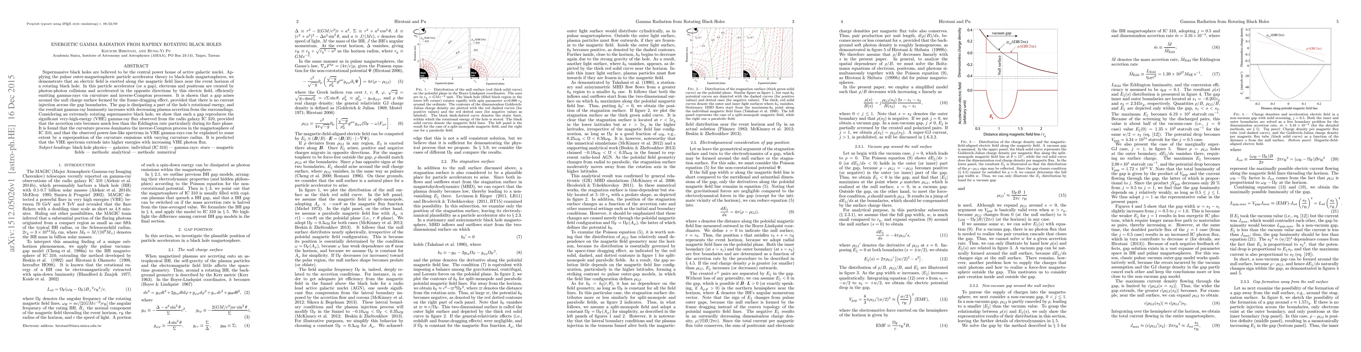 Supermassive black holes are believed to be the central power house of active galactic nuclei. Applying the pulsar outer-magnetospheric particle accelerator theory to black-hole magnetospheres, we demonstrate that an electric field is exerted along the magnetic field lines near the event horizon of a rotating black hole. In this particle accelerator (or a gap), electrons and positrons are created by photon-photon collisions and accelerated in the opposite directions by this electric field, efficiently emitting gamma-rays via curvature and inverse-Compton processes. It is shown that a gap arises around the null charge surface formed by the frame-dragging effect, provided that there is no current injection across the gap boundaries. The gap is dissipating a part of the hole's rotational energy, and the resultant gamma-ray luminosity increases with decreasing plasma accretion from the surroundings. Considering an extremely rotating supermassive black hole, we show that such a gap reproduces the significant very-high-energy (VHE) gamma-ray flux observed from the radio galaxy IC 310, provided that the accretion rate becomes much less than the Eddington rate particularly during its flare phase. It is found that the curvature process dominates the inverse-Compton process in the magnetosphere of IC~310, and that the observed power-law-like spectrum in VHE gamma-rays can be explained to some extent by a superposition of the curvature emissions with varying curvature radius. It is predicted that the VHE spectrum extends into higher energies with increasing VHE photon flux.