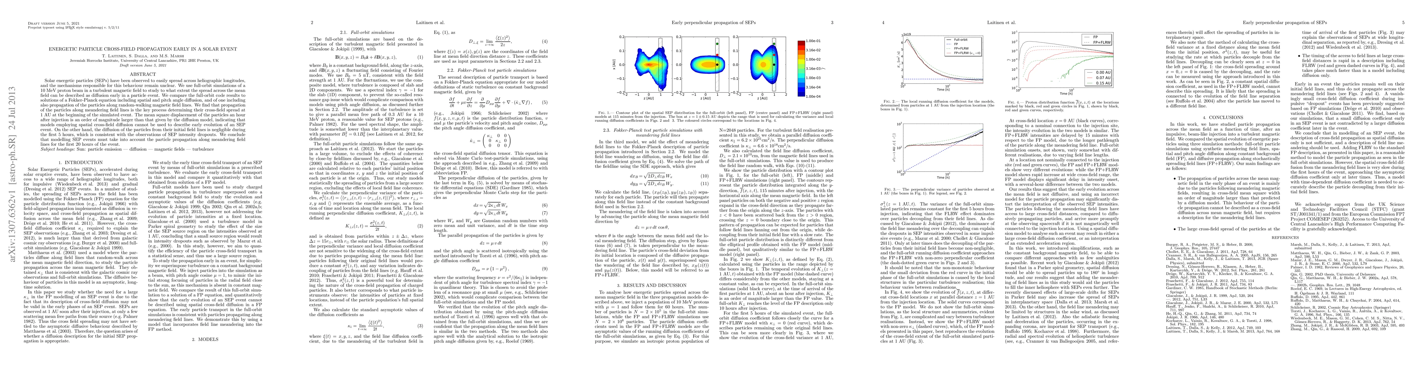 Solar energetic particles (SEPs) have been observed to easily spread across heliographic longitudes, and the mechanisms responsible for this behaviour remain unclear. We use full-orbit simulations of a 10 MeV proton beam in a turbulent magnetic field to study to what extent the spread across the mean field can be described as diffusion early in a particle event. We compare the full-orbit code results to solutions of a Fokker-Planck equation including spatial and pitch angle diffusion, and of one including also propagation of the particles along random-walking magnetic field lines. We find that propagation of the particles along meandering field lines is the key process determining their cross-field spread at 1 AU at the beginning of the simulated event. The mean square displacement of the particles an hour after injection is an order of magnitude larger than that given by the diffusion model, indicating that models employing spatial cross-field diffusion cannot be used to describe early evolution of an SEP event. On the other hand, the diffusion of the particles from their initial field lines is negligible during the first 5 hours, which is consistent with the observations of SEP intensity dropouts. We conclude that modelling SEP events must take into account the particle propagation along meandering field lines for the first 20 hours of the event.