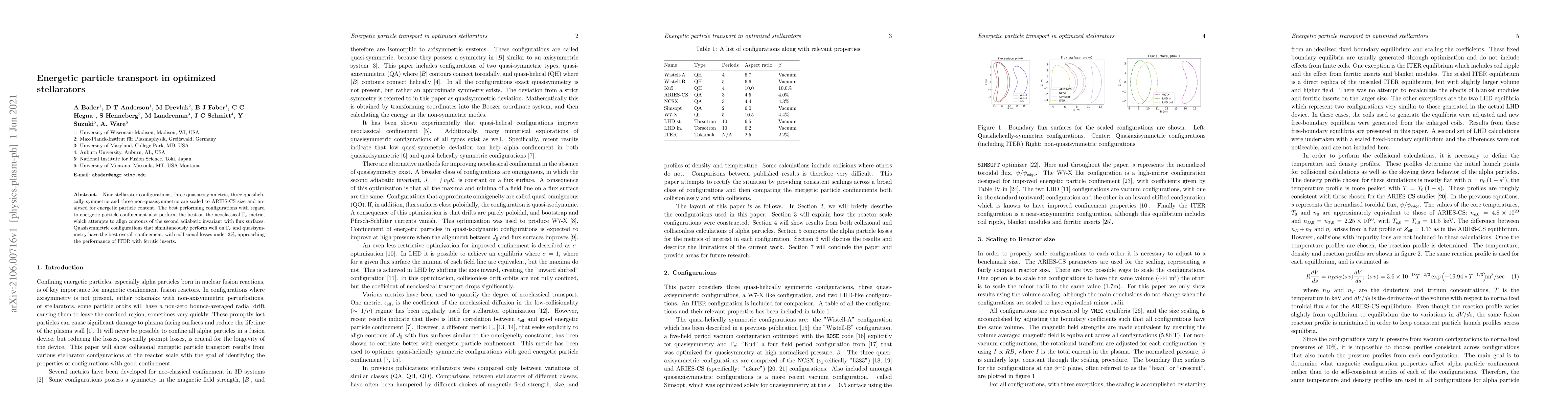 This study evaluates nine stellarator configurations for energetic particle transport, finding that quasisymmetric designs with optimal neoclassical confinement metrics also exhibit superior energetic particle confinement, achieving collisional losses below 3% and nearing ITER performance.