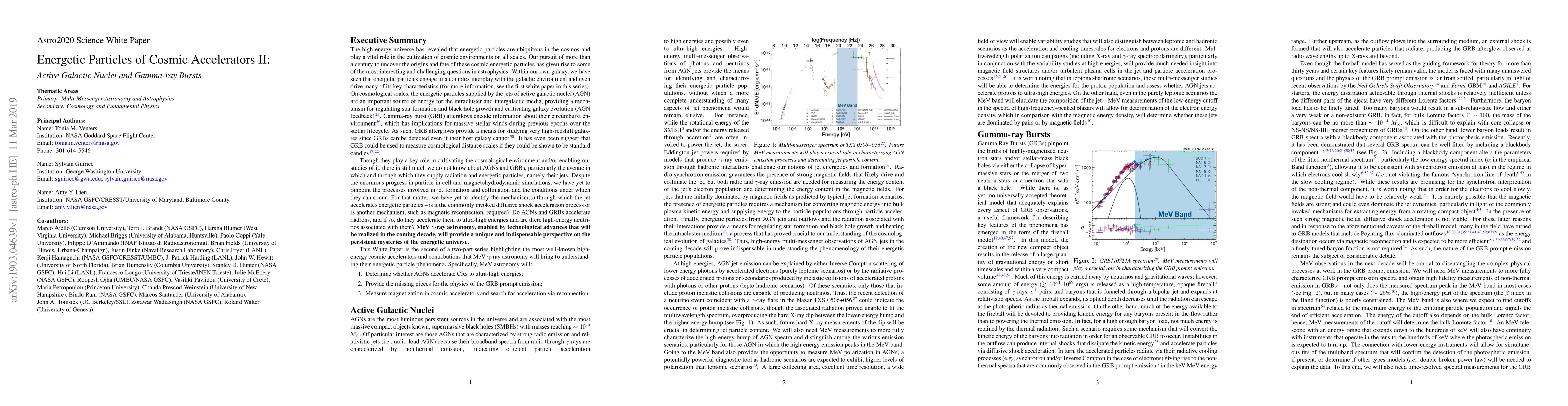 This paper explores the role of energetic particles in active galactic nuclei (AGNs) and gamma-ray bursts (GRBs), emphasizing their contribution to cosmic environments and the mysteries surrounding their particle jets. It highlights how MeV gamma-ray astronomy can enhance our understanding of these high-energy cosmic accelerators.