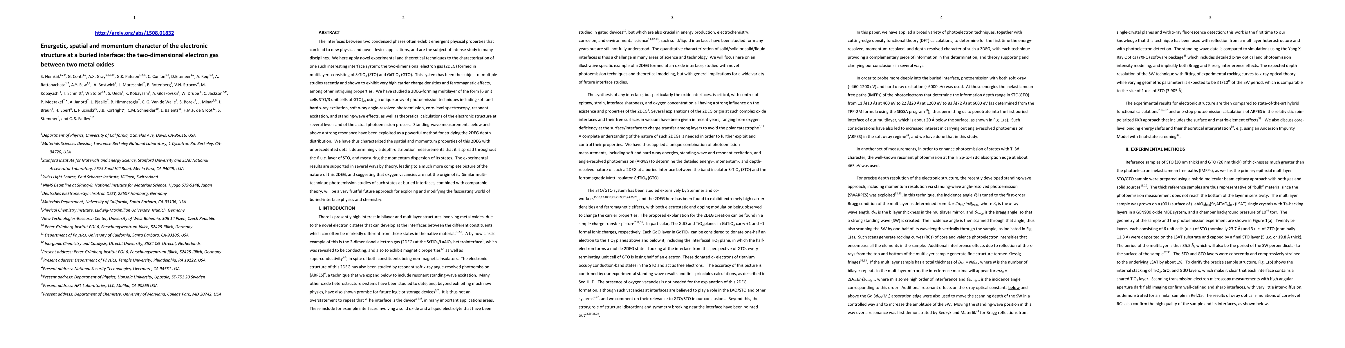 Researchers studied a buried interface between two metal oxides to understand its unique properties, including high carrier charge densities and ferromagnetic effects. They used advanced photoemission techniques and theory to characterize the 2D electron gas's spatial and momentum characteristics.