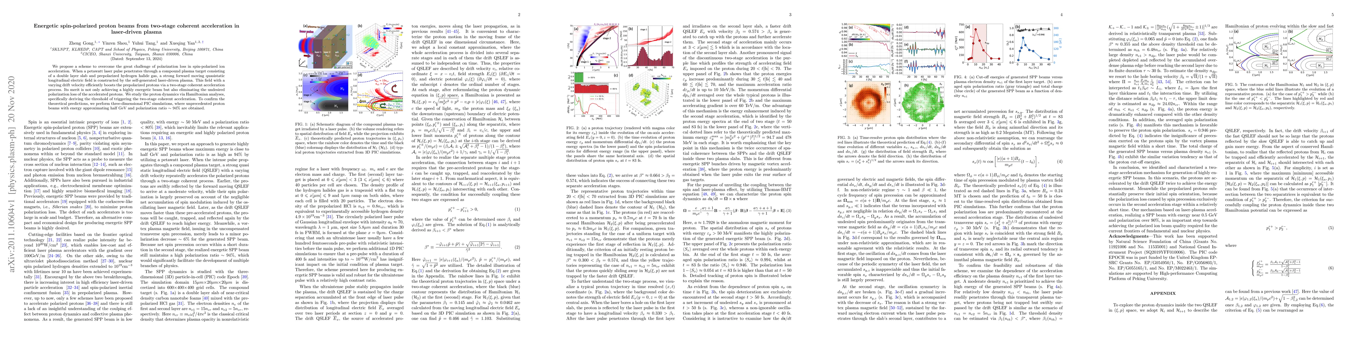 This paper proposes a method to generate highly energetic, spin-polarized proton beams using a two-stage coherent acceleration process in laser-driven plasma, overcoming polarization loss. Simulations show protons achieving energies near 500 MeV with a polarization ratio of approximately 94%.