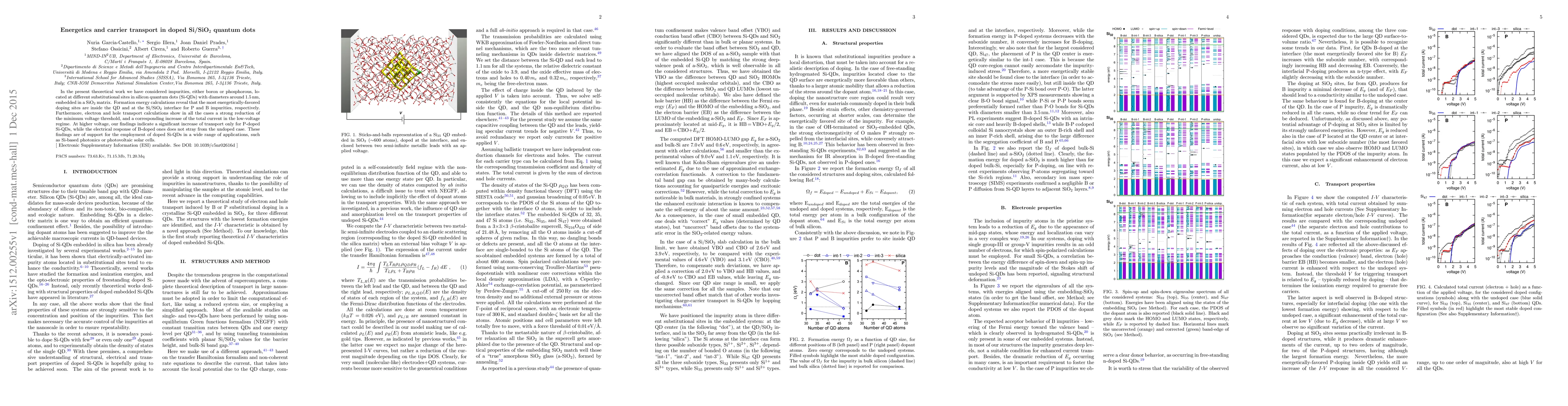 In the present theoretical work we have considered impurities, either boron or phosphorous, located at different substitutional sites in silicon quantum dots (Si-QDs) with diameters around 1.5\,nm, embedded in a SiO2 matrix. Formation energy calculations reveal that the most energetically-favored doping sites are inside the QD and at the Si/SiO2 interface for P and B impurities, respectively. Furthermore, electron and hole transport calculations show in all the cases a strong reduction of the minimum voltage threshold, and a corresponding increase of the total current in the low-voltage regime. At higher voltage, our findings indicate a significant increase of transport only for P-doped Si-QDs, while the electrical response of B-doped ones does not stray from the undoped case. These findings are of support for the employment of doped Si-QDs in a wide range of applications, such as Si-based photonics or photovoltaic solar cells.