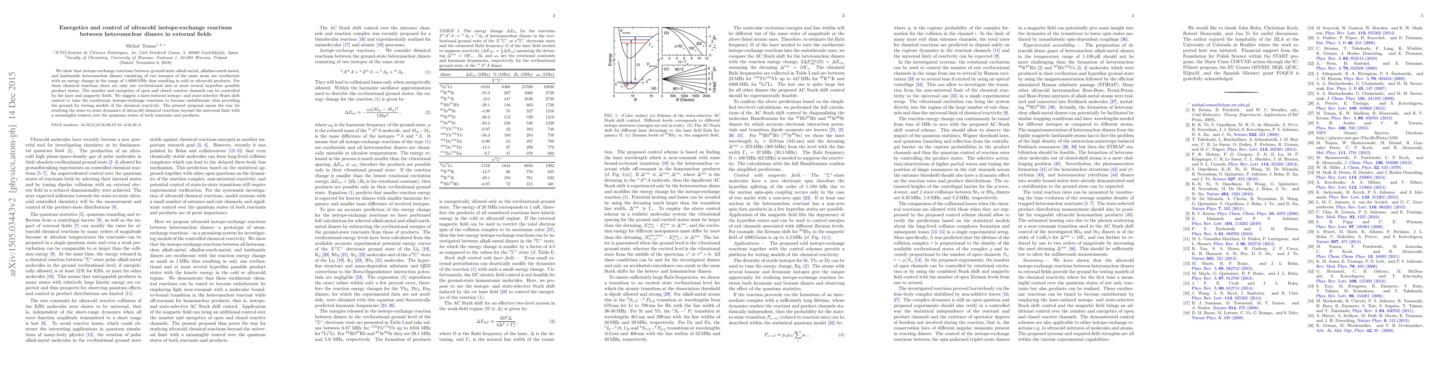 This paper investigates exothermic isotope-exchange reactions between heteronuclear dimers, demonstrating control over reaction energetics and channels via laser and magnetic fields. The proposed laser-induced Stark shift method aims to reverse reaction exothermicity, enabling detailed study of ultracold chemical reaction dynamics.