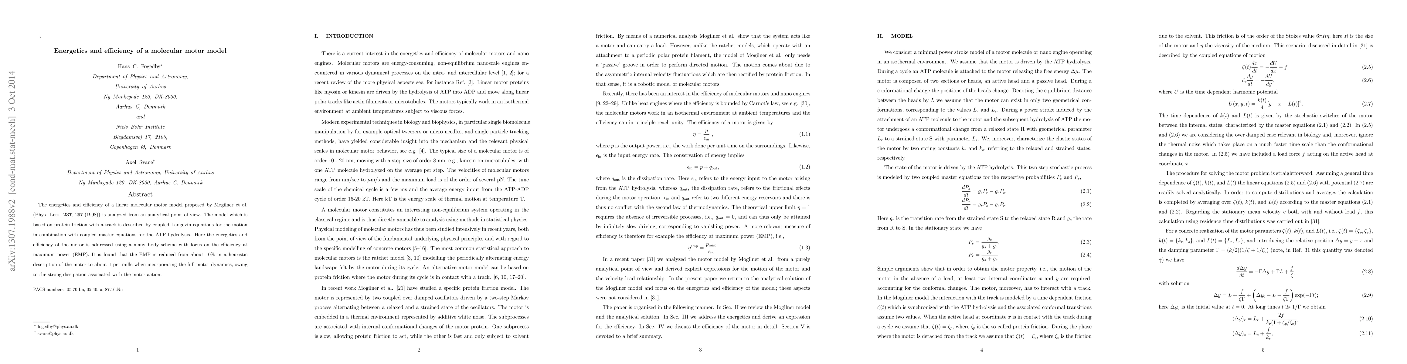 A molecular motor model is analyzed for its efficiency and energetics, finding that adding full motor dynamics reduces maximum power output from 10% to less than 1%. This highlights the significant energy loss associated with motor action.
