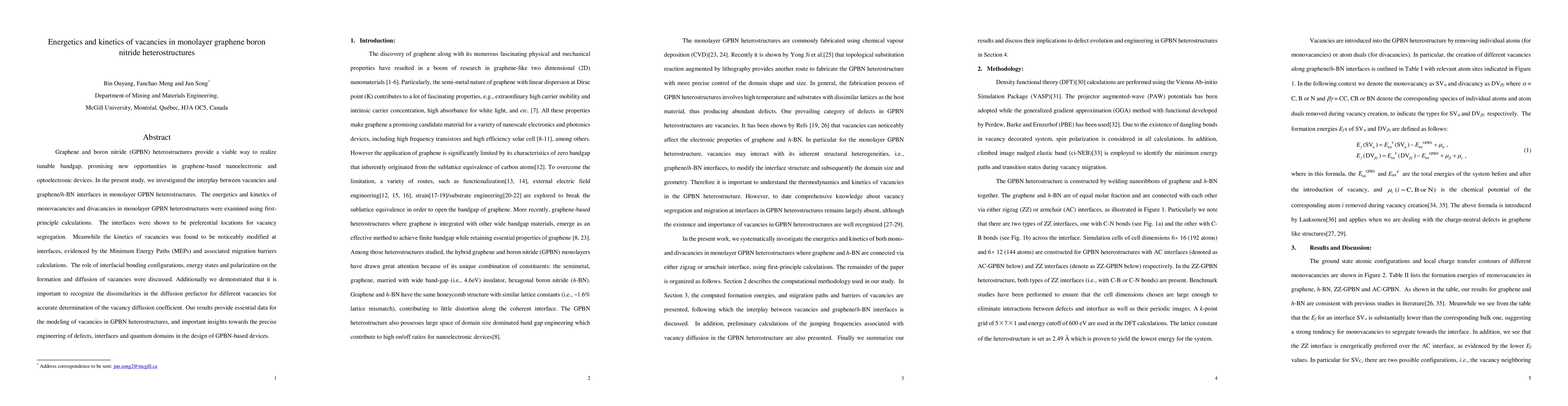 This study investigates the energetics and kinetics of vacancies in monolayer graphene-boron nitride heterostructures using first-principle calculations, revealing that interfaces are preferential sites for vacancy segregation and significantly alter vacancy migration barriers. The research highlights the importance of understanding different vacancy diffusion prefactors for accurate modeling and defect engineering in GPBN-based devices.