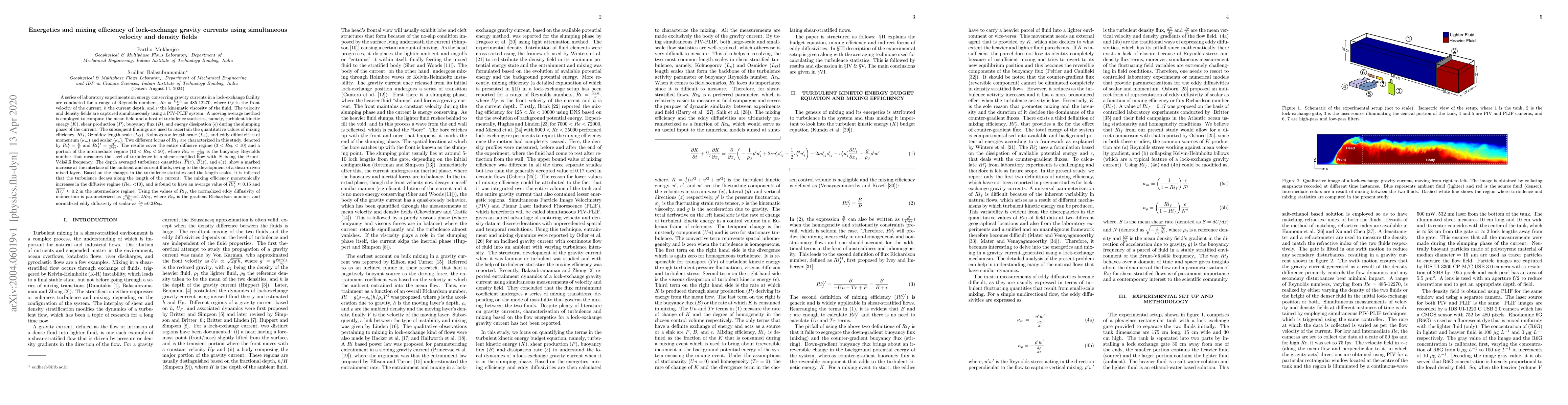 This study investigates the energetics and mixing efficiency of lock-exchange gravity currents through laboratory experiments, employing PIV-PLIF to capture velocity and density fields. The analysis reveals a marked increase in turbulence statistics at the current-ambient interface, indicating a shear-driven mixed layer, and shows that mixing efficiency increases monotonically in the diffusive regime, with an upper bound in the intermediate regime.