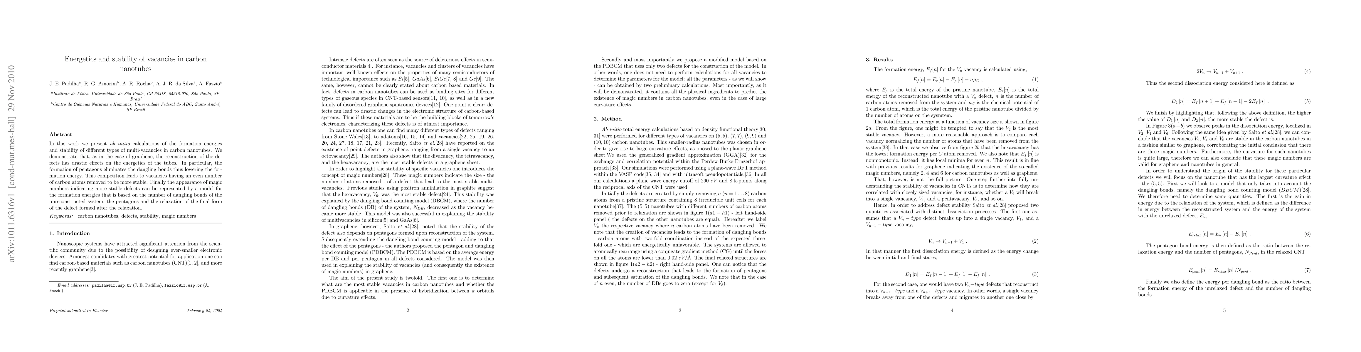 In this work we present ab initio calculations of the formation energies and stability of different types of multi-vacancies in carbon nanotubes. We demonstrate that, as in the case of graphene, the reconstruction of the defects has drastic effects on the energetics of the tubes. In particular, the formation of pentagons eliminates the dangling bonds thus lowering the formation energy. This competition leads to vacancies having an even number of carbon atoms removed to be more stable. Finally the appearance of magic numbers indicating more stable defects can be represented by a model for the formation energies that is based on the number of dangling bonds of the unreconstructed system, the pentagons and the relaxation of the final form of the defect formed after the relaxation.
