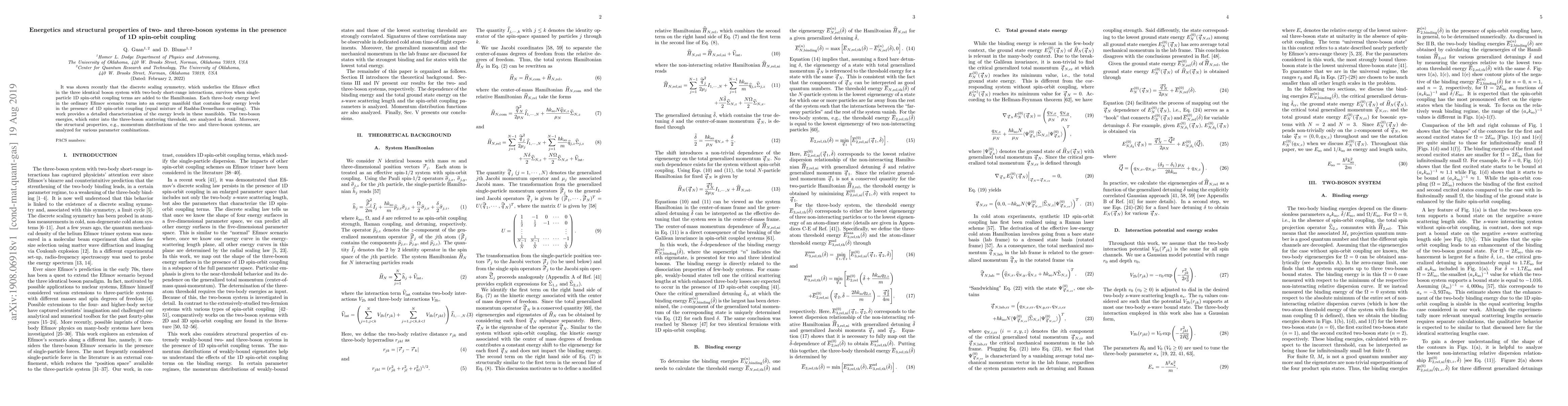 This paper investigates the energetics and structural properties of two- and three-boson systems under 1D spin-orbit coupling, revealing that the Efimov effect persists and transforms into a manifold of four energy levels. It also analyzes the two-boson energies and momentum distributions for various coupling parameters.