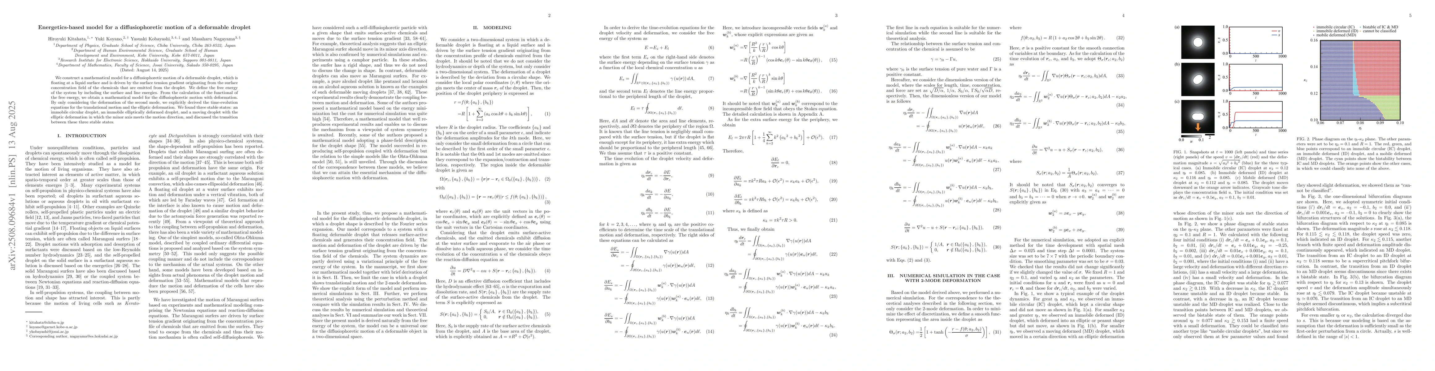 This paper presents a mathematical model for the diffusiophoretic motion of a deformable droplet, driven by surface tension gradient from chemicals emitted by the droplet. The model, based on free energy including surface and line energies, predicts three stable states: a circular immobile droplet, an elliptically deformed immobile droplet, and a moving elliptically deformed droplet. It derives time-evolution equations for translational motion and elliptic deformation, focusing on second mode deformation.
