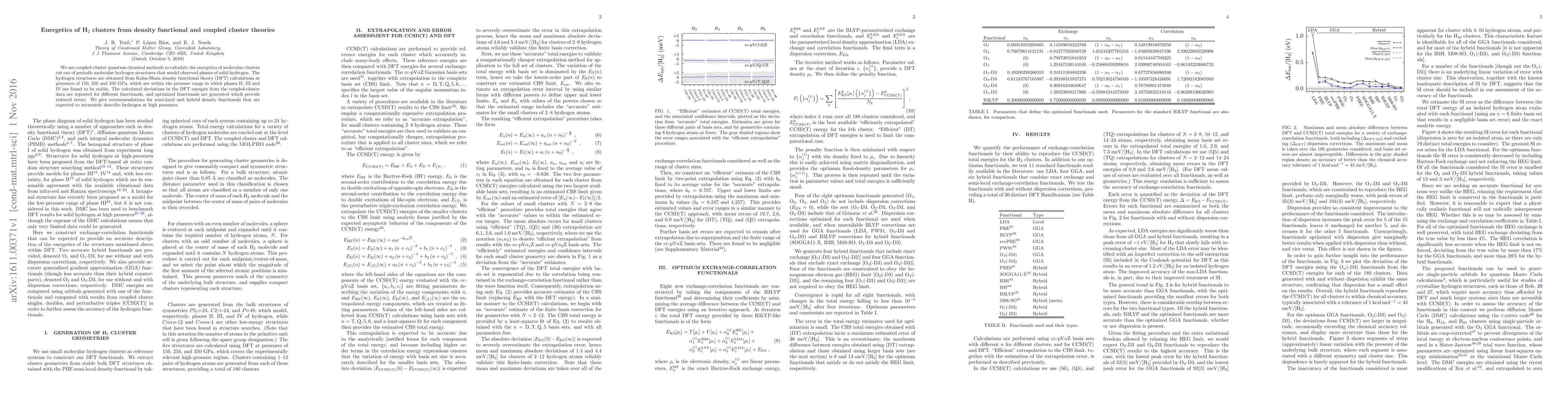 We use coupled-cluster quantum chemical methods to calculate the energetics of molecular clusters cut out of periodic molecular hydrogen structures that model observed phases of solid hydrogen. The hydrogen structures are obtained from Kohn-Sham density functional theory (DFT) calculations at pressures of 150, 250 and 350 GPa, which are within the pressure range in which phases II, III and IV are found to be stable. The calculated deviations in the DFT energies from the coupled-cluster data are reported for different functionals, and optimized functionals are generated which provide reduced errors. We give recommendations for semi-local and hybrid density functionals that are expected to accurately describe hydrogen at high pressures.