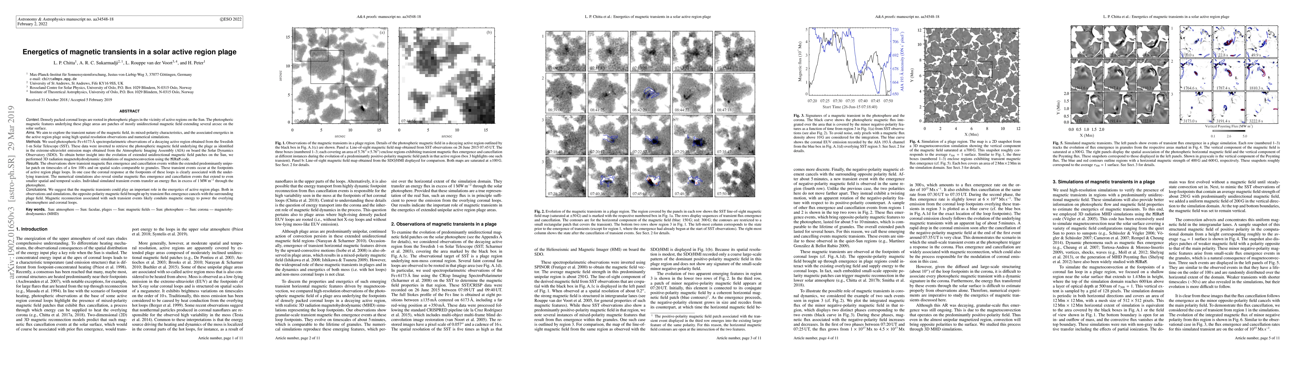 Densely packed coronal loops are rooted in plages in the vicinity of active regions on the Sun. The photospheric magnetic features underlying these plages are patches of mostly unidirectional magnetic field extending several arcsec on the solar surface. We aim to explore the transient nature of the magnetic field, its mixed-polarity characteristics, and the associated energetics in plages using high resolution observations and simulations. We used photospheric Fe I 6173 {\AA} spectropolarimetric observations of a decaying active region obtained from the SST. These data were inverted to retrieve the photospheric magnetic field underlying the plage as identified in the EUV emission maps obtained from the SDO/AIA. To obtain better insight into the evolution of plages, we performed 3D radiation magnetohydrodynamic simulations of magnetoconvection using the MURaM code. The observations show transient magnetic flux emergence and cancellation events within the plage on timescales of a few 100 s and on spatial scales comparable to granules. These transient events occur at the footpoints of active region plage loops. In one case the coronal response at the footpoints of these loops is clearly associated with the underlying transient. The simulations also reveal similar magnetic flux emergence and cancellation events that extend to even smaller spatial and temporal scales. Individual simulated transient events transfer an energy flux in excess of 1 MW m$^{-2}$ through the photosphere. We suggest that the magnetic transients could play an important role in the energetics of active region plage. Both in observations and simulations, the opposite-polarity magnetic field brought up by transient flux emergence cancels with the surrounding plage field. Magnetic reconnection associated with such transient events likely conduits magnetic energy to power the overlying chromosphere and coronal loops.