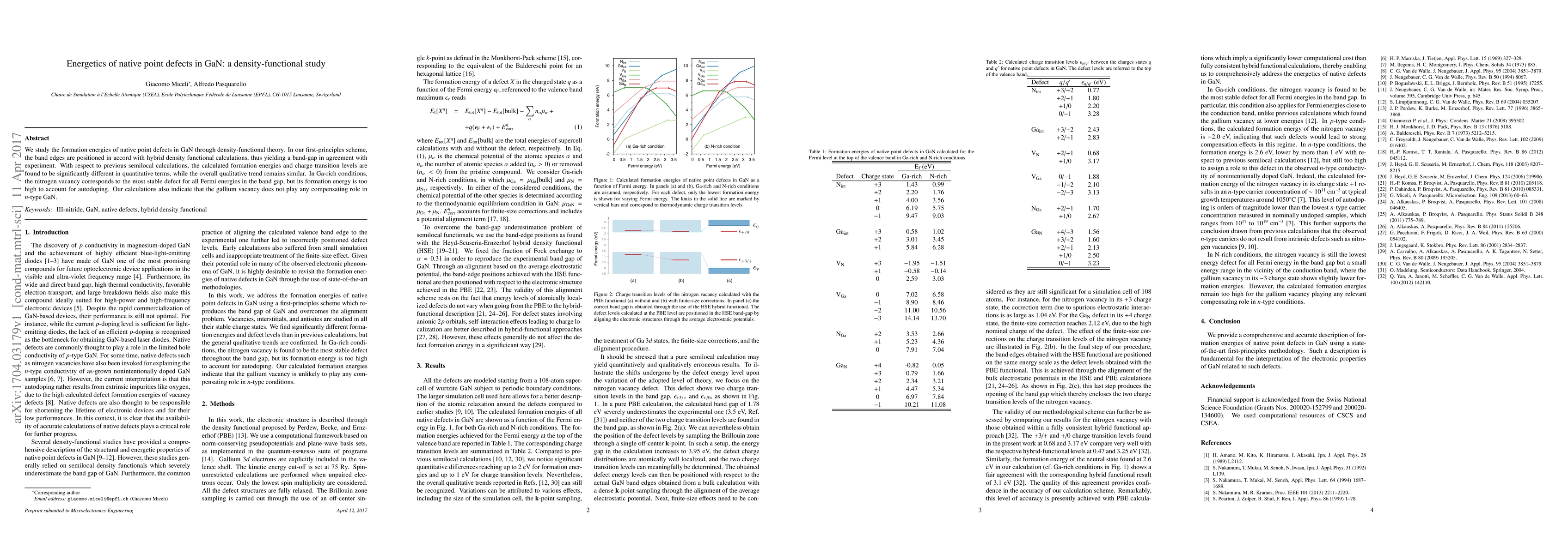 Researchers used density-functional theory to study native point defects in GaN, finding that nitrogen vacancies are stable under certain conditions but have high formation energies; gallium vacancies do not compensate for n-type GaN.