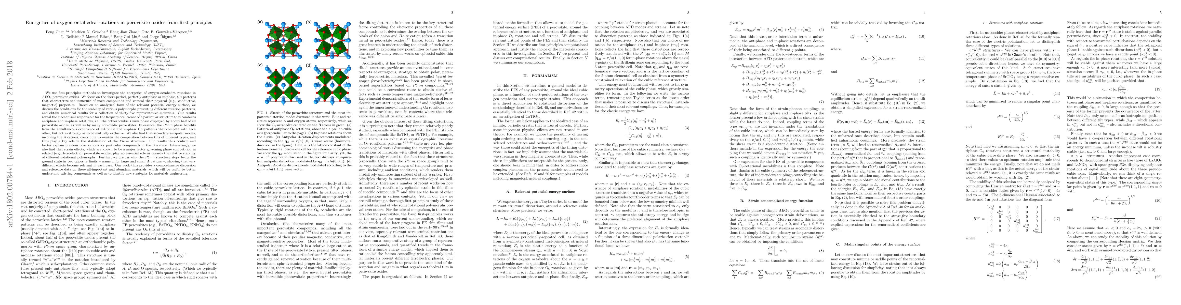This paper uses first-principles methods to investigate oxygen-octahedra rotations in perovskite oxides, focusing on the stability conditions of different tilt patterns. The study reveals that the orthorhombic Pbnm phase is favored due to the coexistence of antiphase and in-phase rotations, with secondary antipolar modes contributing to this stability, and finds that strain effects do not significantly influence polymorph stability.